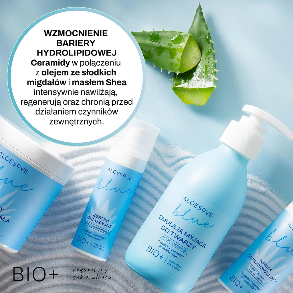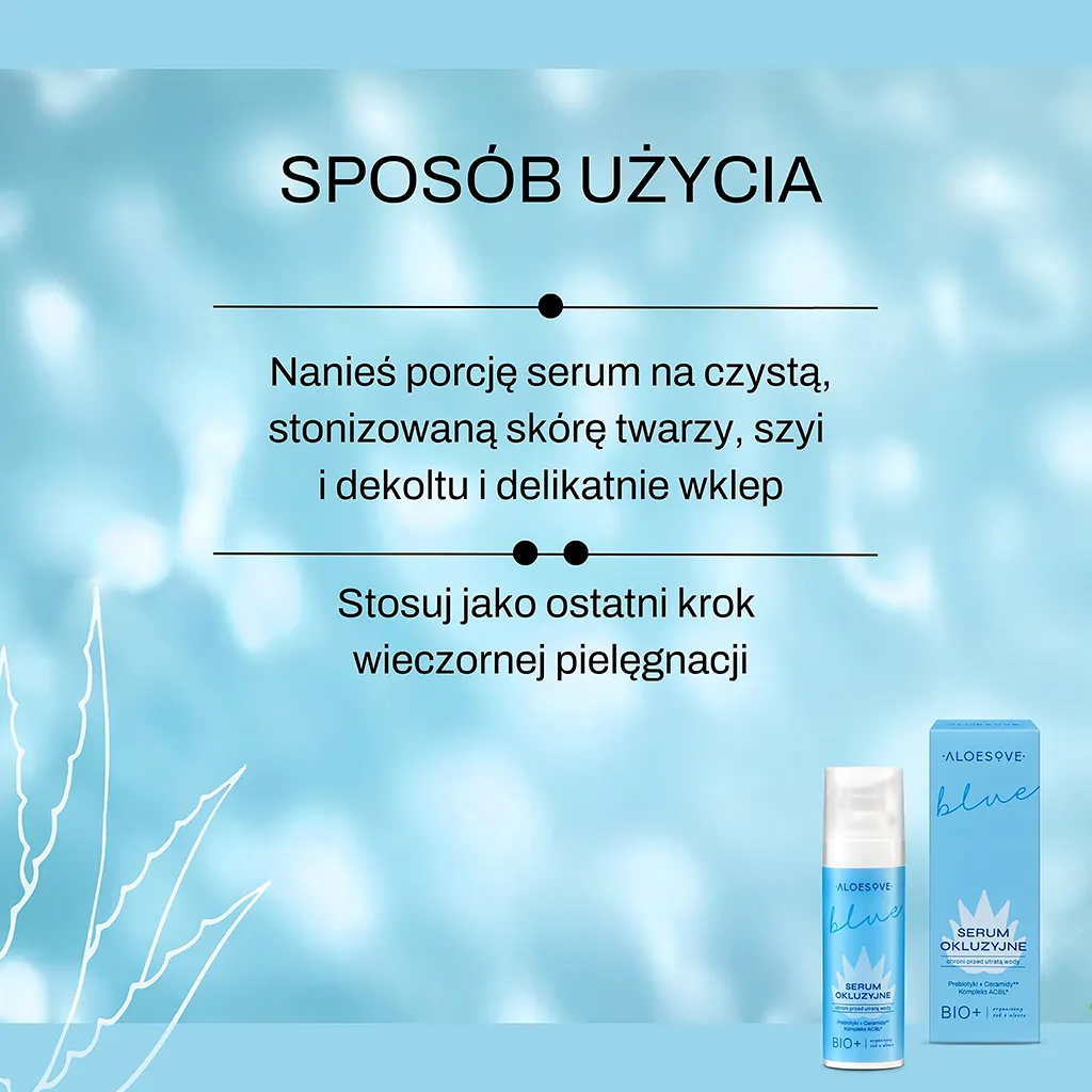 Serum okluzyjne ALOESOVE BLUE to intensywnie nawilżający produkt do każdego typu cery, szczególnie suchej i odwodnionej, z zaburzoną barierą hydrolipidową. Tworzy na powierzchni skóry delikatną warstwę okluzyjną, zabezpieczając skórę przed utratą wody oraz wspomaga wchłanianie składników aktywnych.