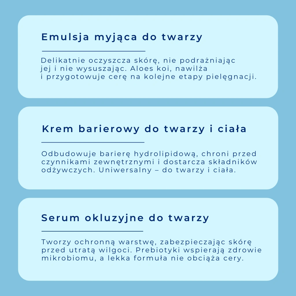 Zestaw ALOESOVE BLUE do twarzy to idealny wybór dla osób, które pragną wzmocnić i odbudować barierę hydrolipidową swojej skóry. Produkty oparte na organicznym ekstrakcie z aloesu oraz prebiotykach zapewniają każdemu rodzajowi skóry niezbędną dawkę antyoksydantów i składników chroniących przed wysuszeniem i utratą elastyczności.