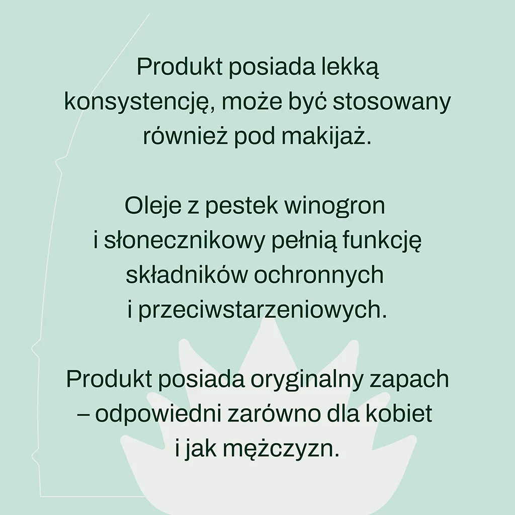 Przeznaczony do codziennej pielęgnacji każdego typu cery, idealny również pod makijaż. Zawiera oleje roślinne o cennych właściwościach ochronnych i przeciwstarzeniowych (z pestek winogron, słonecznikowy) oraz składniki o silnym potencjale antyoksydacyjnym ACGG* i EGCG**.