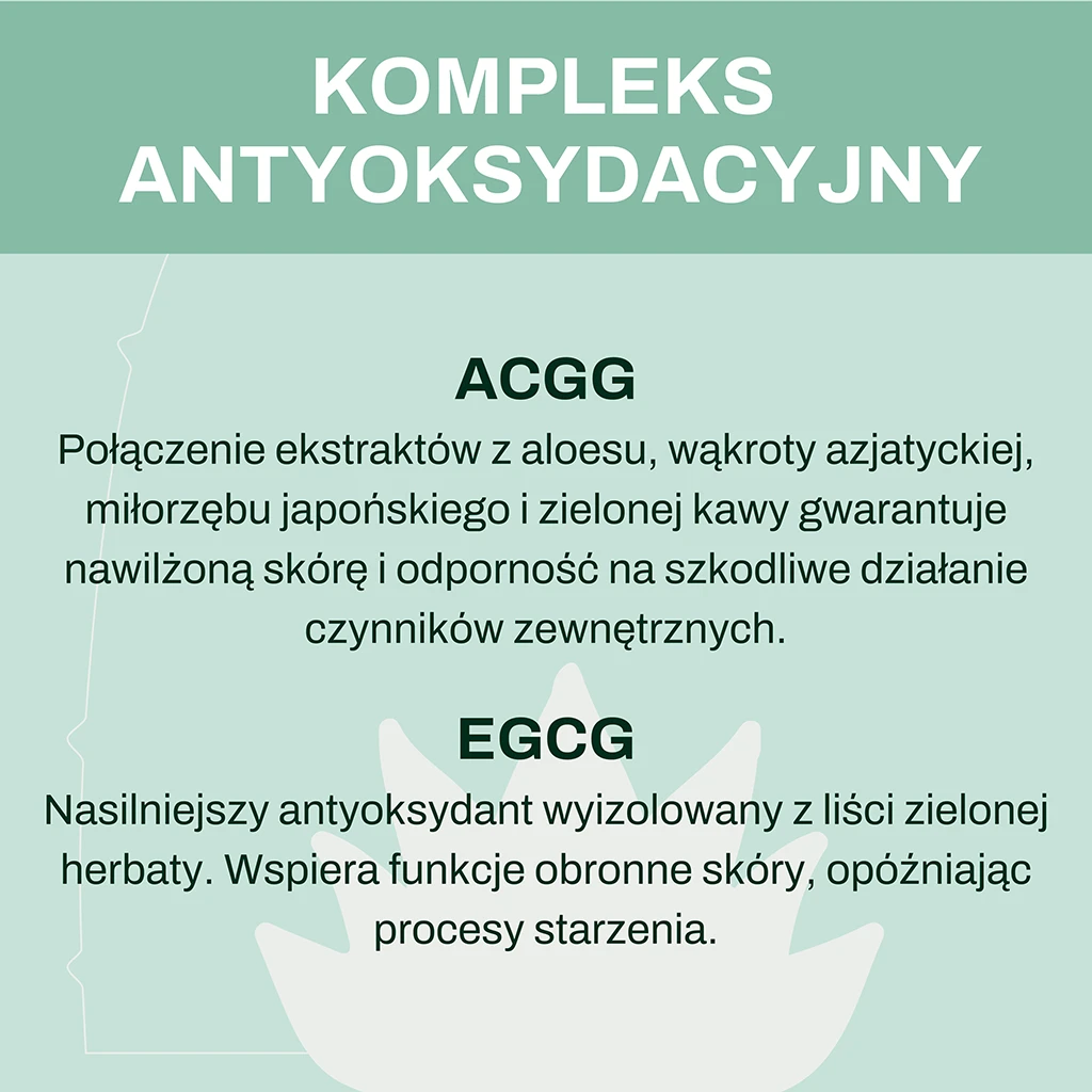 *Kompleks antyoksydacyjny ACGG to unikalne połączenie ekstraktów z aloesu, wąkroty azjatyckiej, miłorzębu japońskiego i zielonej kawy. Synergistyczne działanie gwarantuje utrzymanie skóry w świetnej kondycji, nawilżonej i odpornej na szkodliwe działanie szkodliwych czynników zewnętrznych.