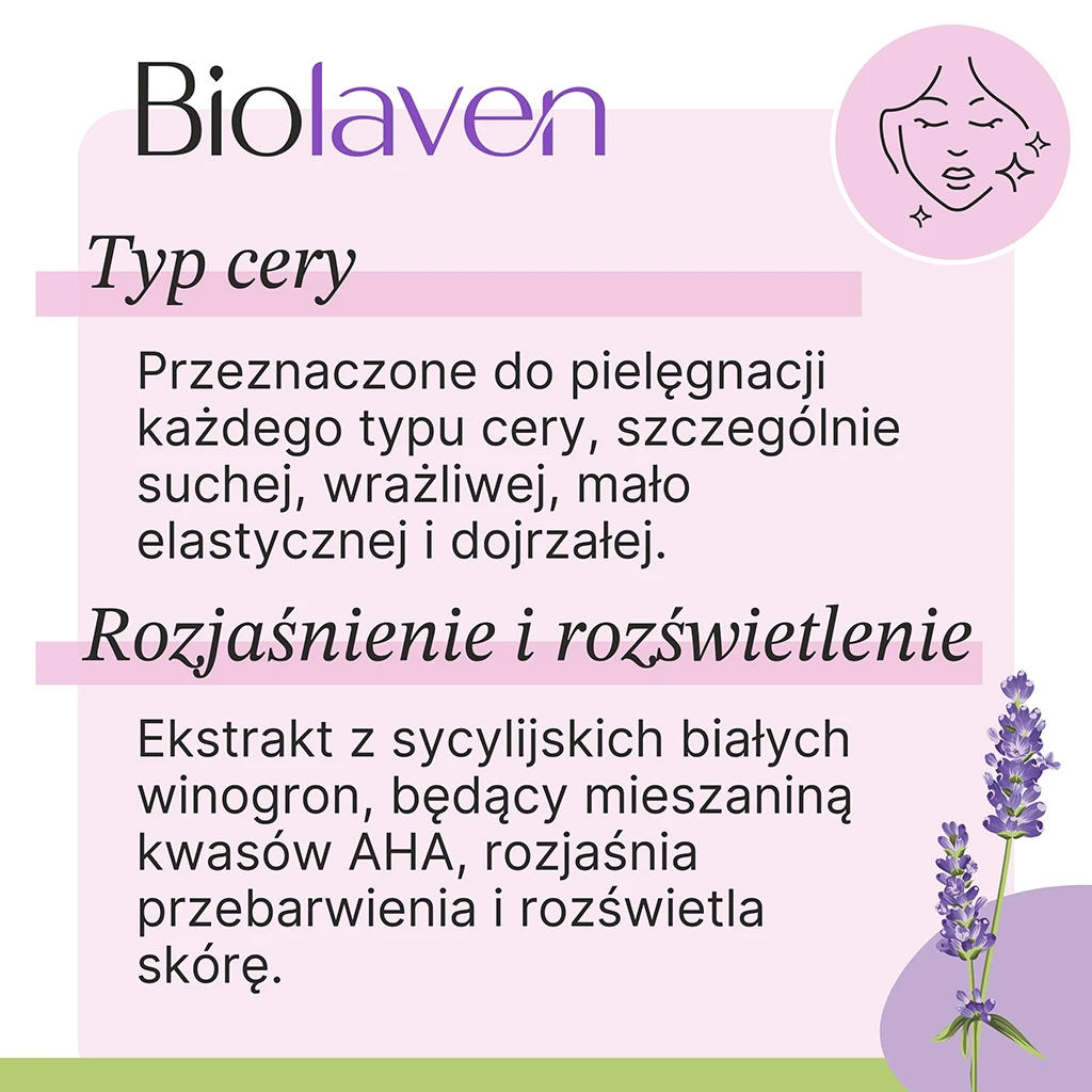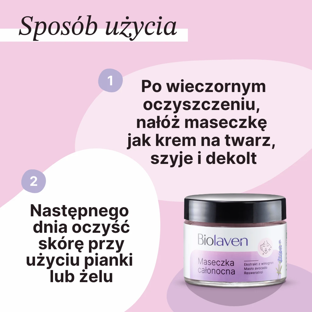 Maseczka całonocna do twarzy do zaawansowanej pielęgnacji każdego typu cery. Zawiera wyjątkowy ekstrakt z sycylijskich białych winogron, zawierający mieszaninę kwasów organicznych (AHA). W połączeniu z resweratrolem, kompleksem ceramidów, kwasem hialuronowym działa dwufunkcyjnie: rozjaśnia i rozświetla dzięki złuszczającym właściwościom kwasów oraz spłyca istniejące zmarszczki, silnie nawilża i znacznie uelastycznia skórę twarzy, szyi i dekoltu. Maseczka maksymalnie wykorzystuje zdolności regeneracyjne, zachodzące nocą we wszystkich warstwach skóry. Systematyczne stosowanie zapewnia jej jednolity koloryt i strukturę.