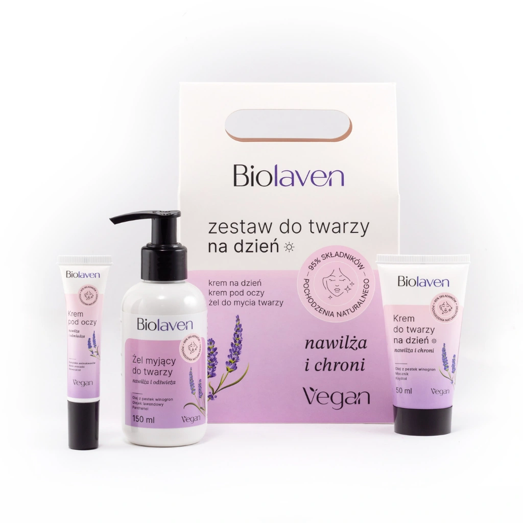 Zestaw kosmetyków do codziennej pielęgnacji twarzy BIOLAVEN to idealna propozycja dla osób, które pragną nawilżyć skórę i ochronić ją przed wysuszeniem i szkodliwymi czynnikami zewnętrznymi. Kosmetyki zawarte w zestawie swoje skuteczne działanie nawilżające, regenerujące i odżywcze zawdzięczają naturalnym składnikom, takim jak lawenda i olej z pestek winogron.