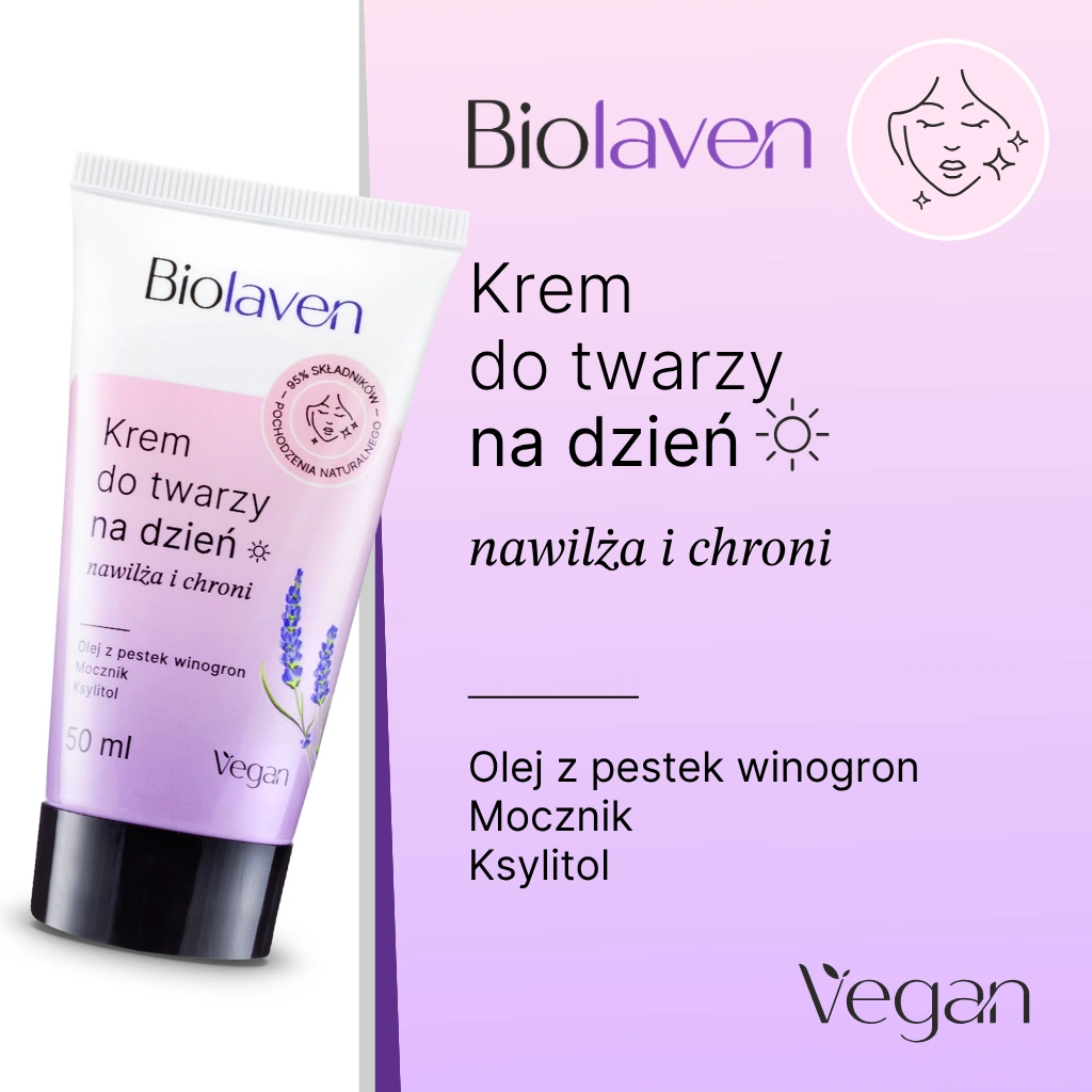 - BIOLAVEN Krem do twarzy na dzień – o lekkiej, nawilżającej formule, która chroni skórę przed utratą wilgoci i dostarcza jej niezbędnych składników odżywczych.