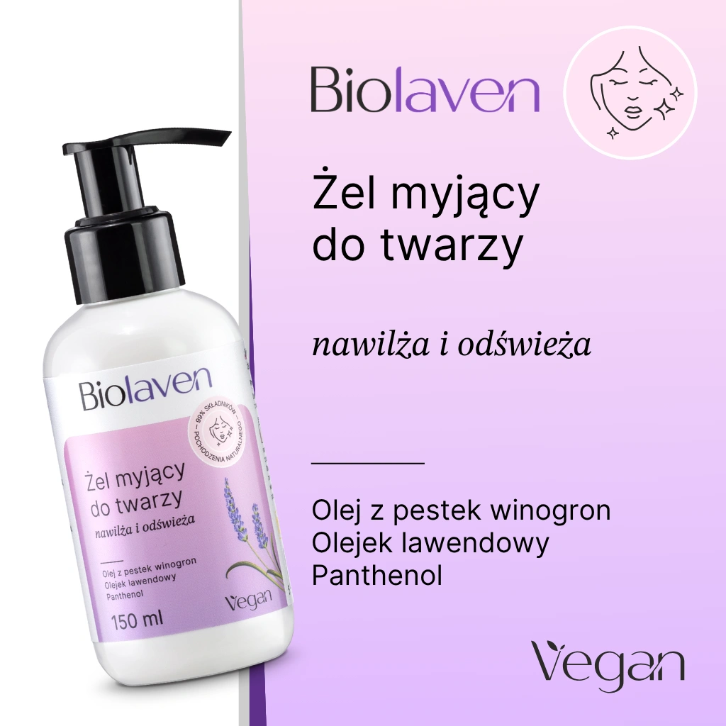 - BIOLAVEN Żel do mycia twarzy – nie pozostawia uczucia ściągnięcia, delikatnie, ale skutecznie oczyszcza, pozostawiając skórę świeżą, miękką i gotową na kolejne etapy pielęgnacji.