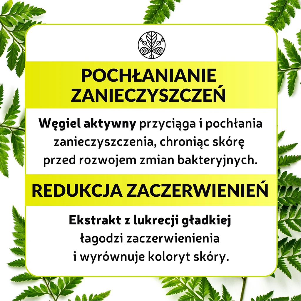 | Działanie | Pochłania zanieczyszczenia, Redukuje zaczerwienienia, Reguluje wydzielane sebum |