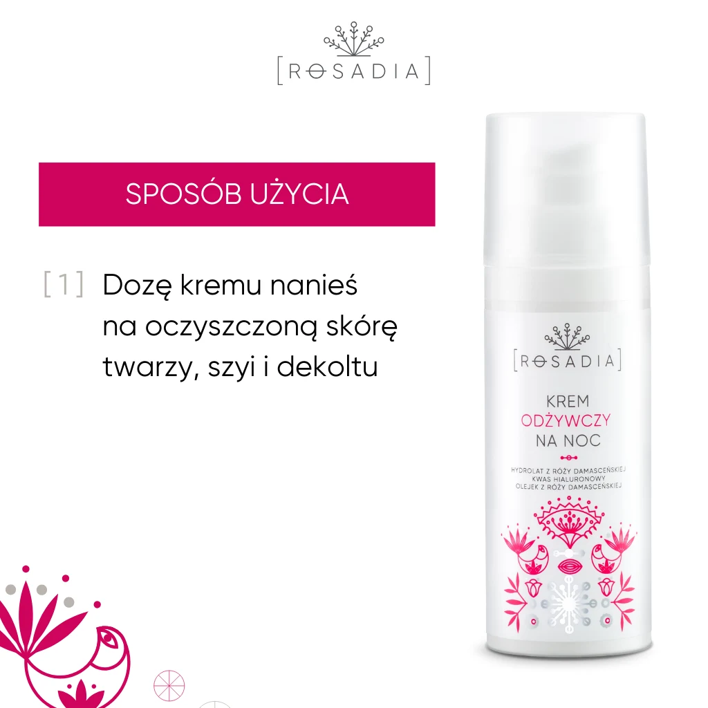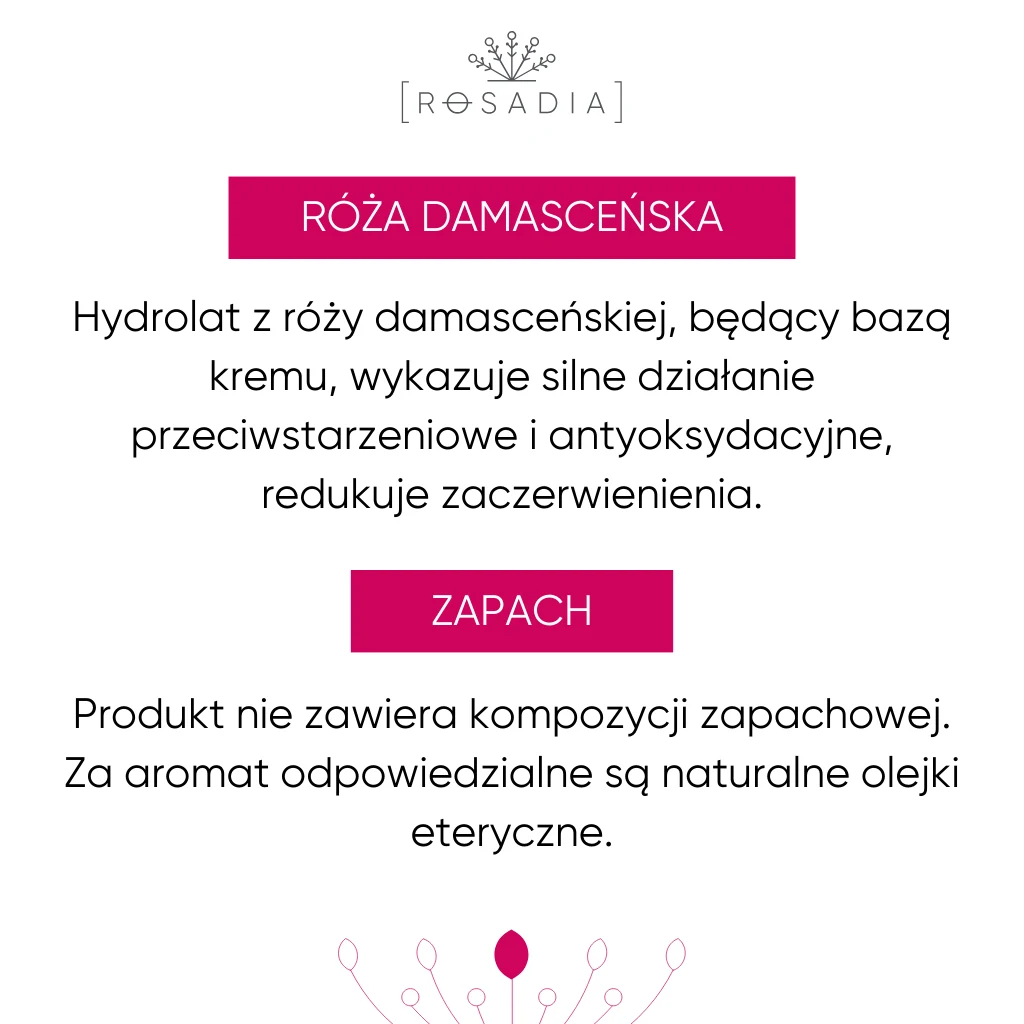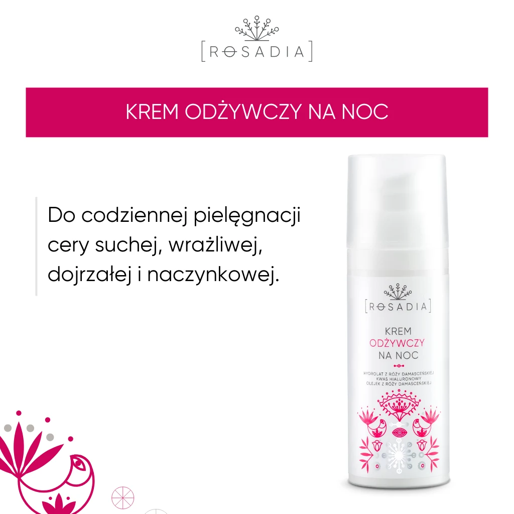 Odżywczy krem do twarzy na noc, przeznaczony do codziennej pielęgnacji cery wrażliwej, dojrzałej lub naczynkowej. Hydrolat z róży damasceńskiej zapewnia intensywne nawilżenie i ukojenie, niwelując wszelkie zaczerwienienia. Kwas hialuronowy zwiększa elastyczność i wygładza drobne zmarszczki. Za odżywienie, regenerację i wzmocnienie bariery lipidowej odpowiadają bogate w witaminy oleje: z pestek winogron, jojoba, z wiesiołka i arganowy. Połączenie witaminy E i cennego olejku eterycznego z róży damasceńskiej spowalnia procesy starzenia i chroni komórki przed uszkodzeniami. Systematyczne stosowanie kremu gwarantuje odnowę i efekt rozświetlonej, gładkiej skóry po przebudzeniu.