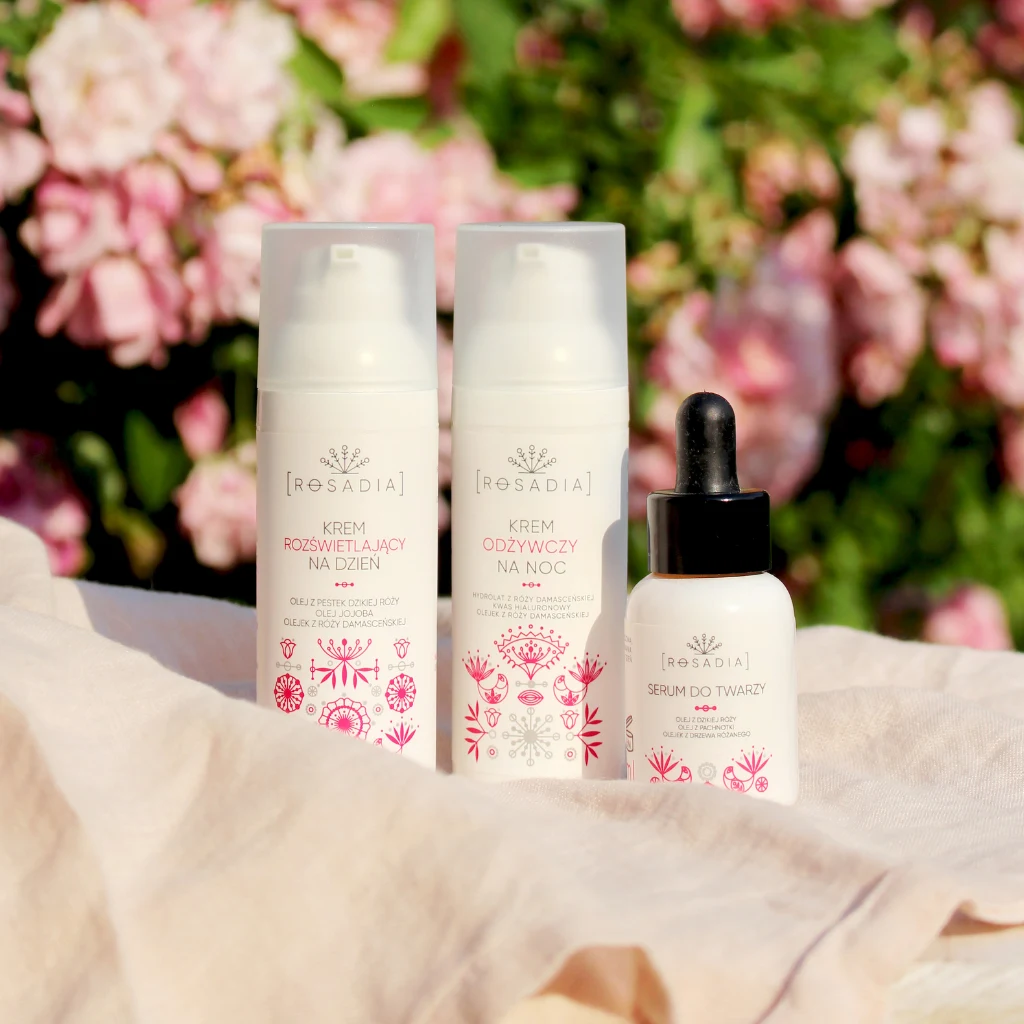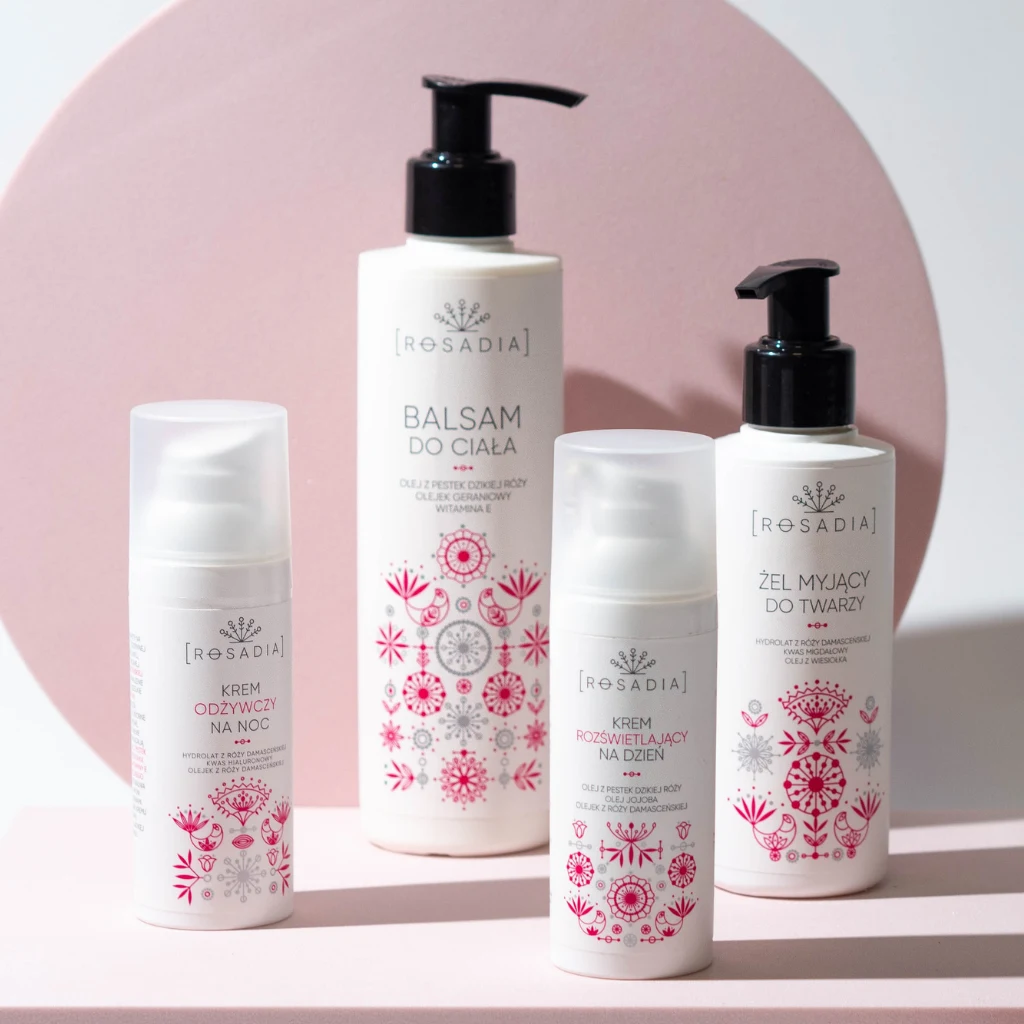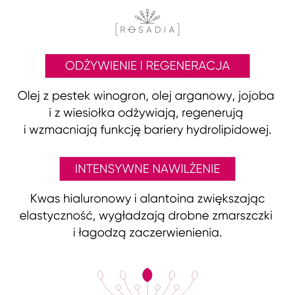 Odżywczy krem do twarzy na noc, przeznaczony do codziennej pielęgnacji cery wrażliwej, dojrzałej lub naczynkowej. Hydrolat z róży damasceńskiej zapewnia intensywne nawilżenie i ukojenie, niwelując wszelkie zaczerwienienia. Kwas hialuronowy zwiększa elastyczność i wygładza drobne zmarszczki. Za odżywienie, regenerację i wzmocnienie bariery lipidowej odpowiadają bogate w witaminy oleje: z pestek winogron, jojoba, z wiesiołka i arganowy. Połączenie witaminy E i cennego olejku eterycznego z róży damasceńskiej spowalnia procesy starzenia i chroni komórki przed uszkodzeniami. Systematyczne stosowanie kremu gwarantuje odnowę i efekt rozświetlonej, gładkiej skóry po przebudzeniu.