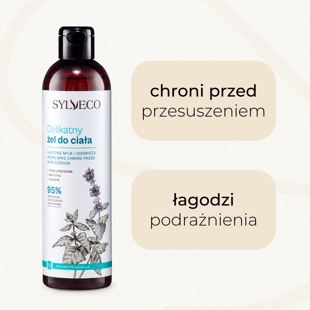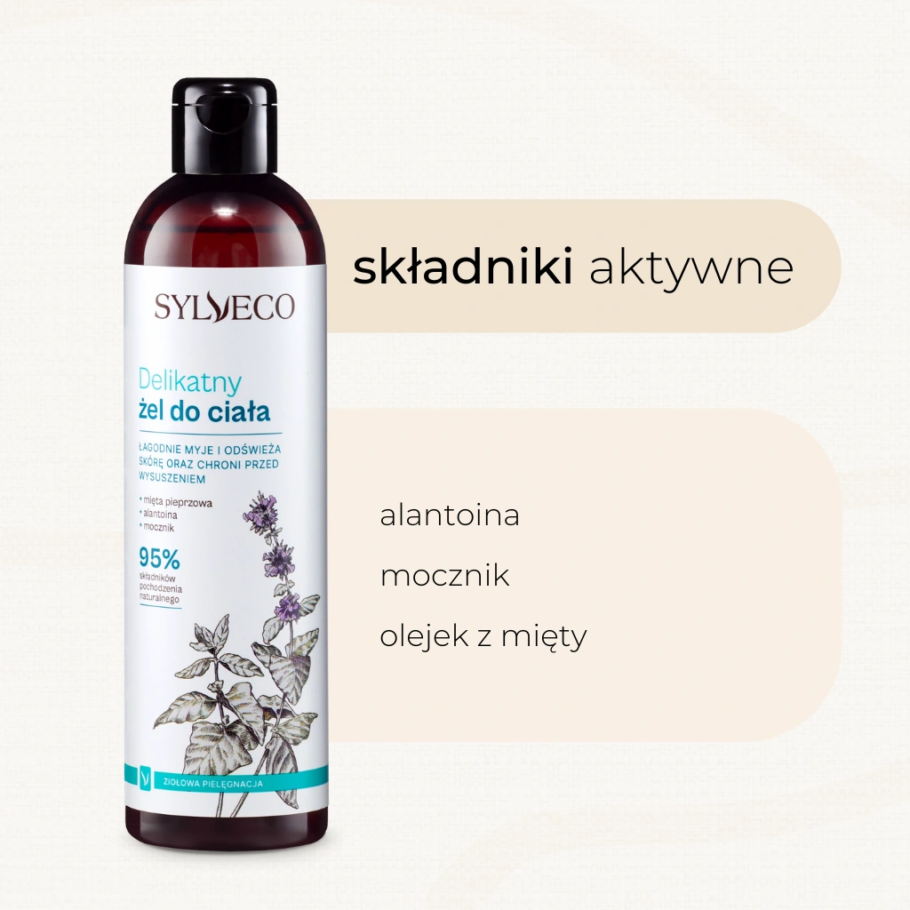 Naturalny, delikatny żel do mycia ciała z orzeźwiającą nutą zapachową, pochodzącą od naturalnego olejku eterycznego z mięty pieprzowej. Zawiera bardzo łagodne, ale jednocześnie skuteczne środki myjące, które nie podrażniają nawet najbardziej wrażliwej skóry. Żel posiada fizjologiczne pH, łatwo tworzy pianę, dokładnie oczyszczając skórę i ją odświeżając. W składzie znalazły się składniki o działaniu łagodzącym i regenerującym, a dodatek gliceryny oraz mocznika zapewnia ochronę przed wysuszeniem. Codzienne stosowanie żelu pod prysznicem, czy w czasie kąpieli, pozwala na odprężenie i ukojenie zmysłów, a skórę pozostawia miękką i w dobrej kondycji.