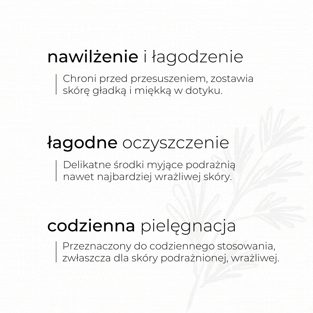 Łagodnie oczyszcza, Nawilża, Łagodzi podrażnienia