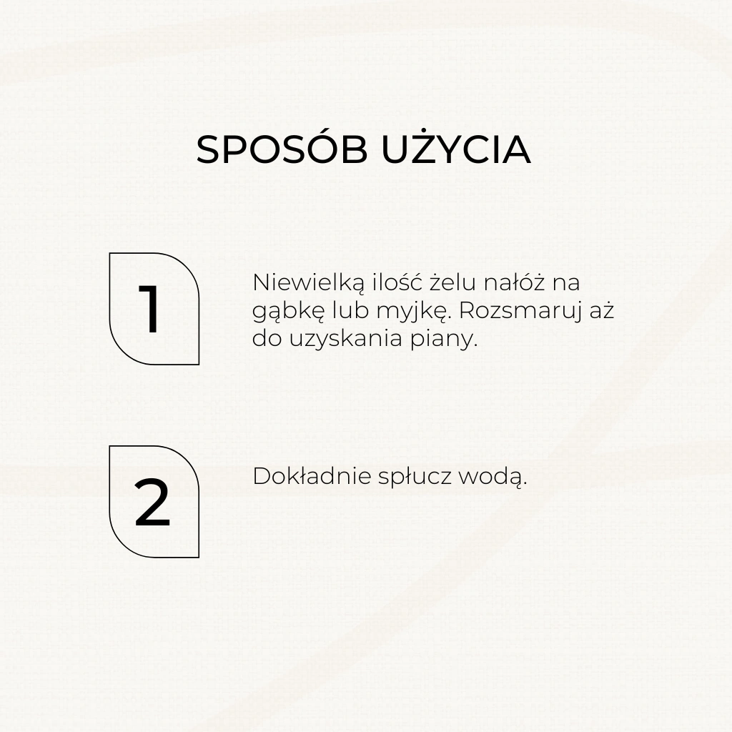 Codzienna pielęgnacja każdego rodzaju skóry w czasie kąpieli i pod prysznicem. Niewielką ilość żelu nanieść na gąbkę lub myjkę, delikatnie rozsmarować zwilżoną skórę kolistymi ruchami, aż do uzyskania piany. Dokładnie spłukać wodą.