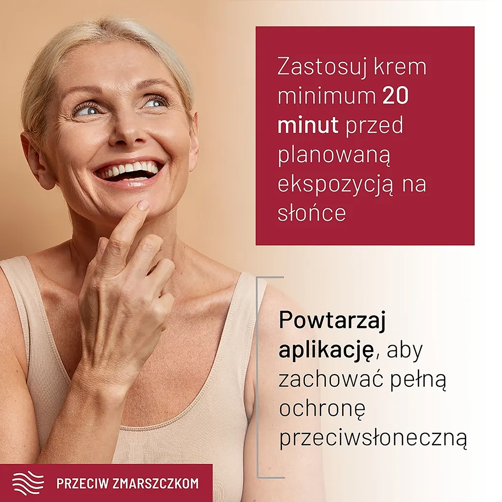 Zastosuj krem minimum 20 minut przed planowaną ekspozycją na słońce. Rozprowadź krem (dwie dozy) równomiernie na twarzy, szyi, dekolcie i uszach. Powtarzaj aplikację, aby zachować pełną ochronę przeciwsłoneczną.