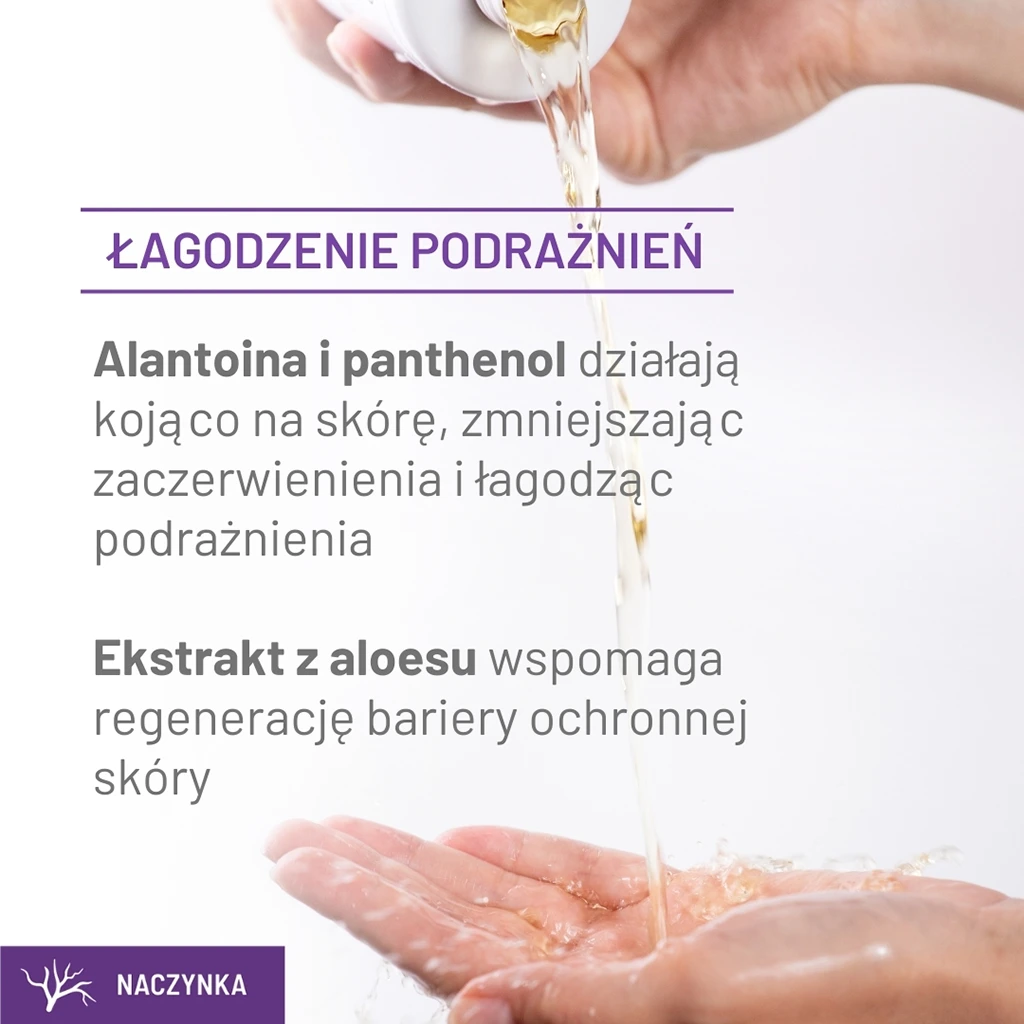 Alantoina i panthenol działają kojąco na skórę, zmniejszając zaczerwienienia i łagodząc podrażnienia. Regenerację bariery ochronnej skóry zapewnia ekstrakt z aloesu. Dzięki zawartości aceroli, produkt wyrównuje koloryt, zmniejsza zaczerwienienia i wzmacnia skórę. Płyn posiada subtelny zapach, oparty na kompozycji zapachowej bez alergenów, dzięki czemu może być stosowany również przez osoby z bardzo delikatną i wrażliwą cerą.