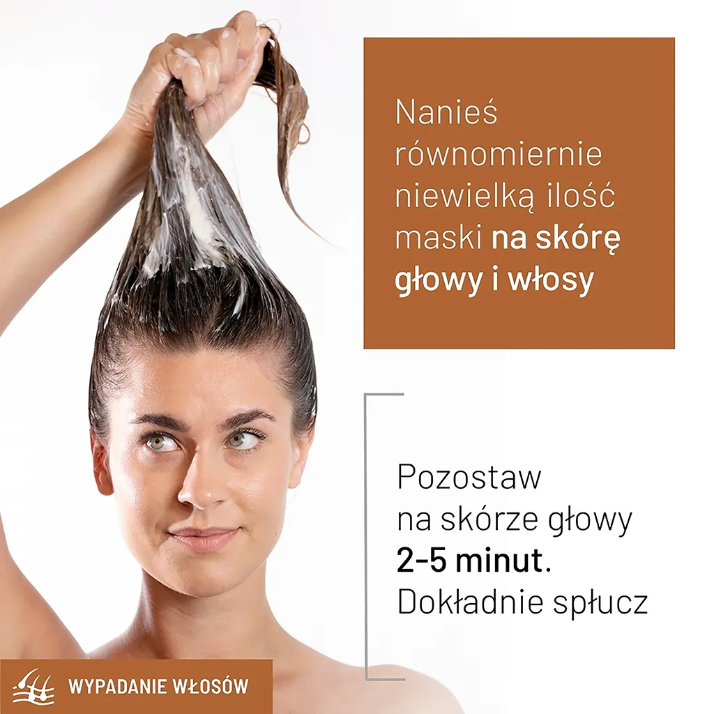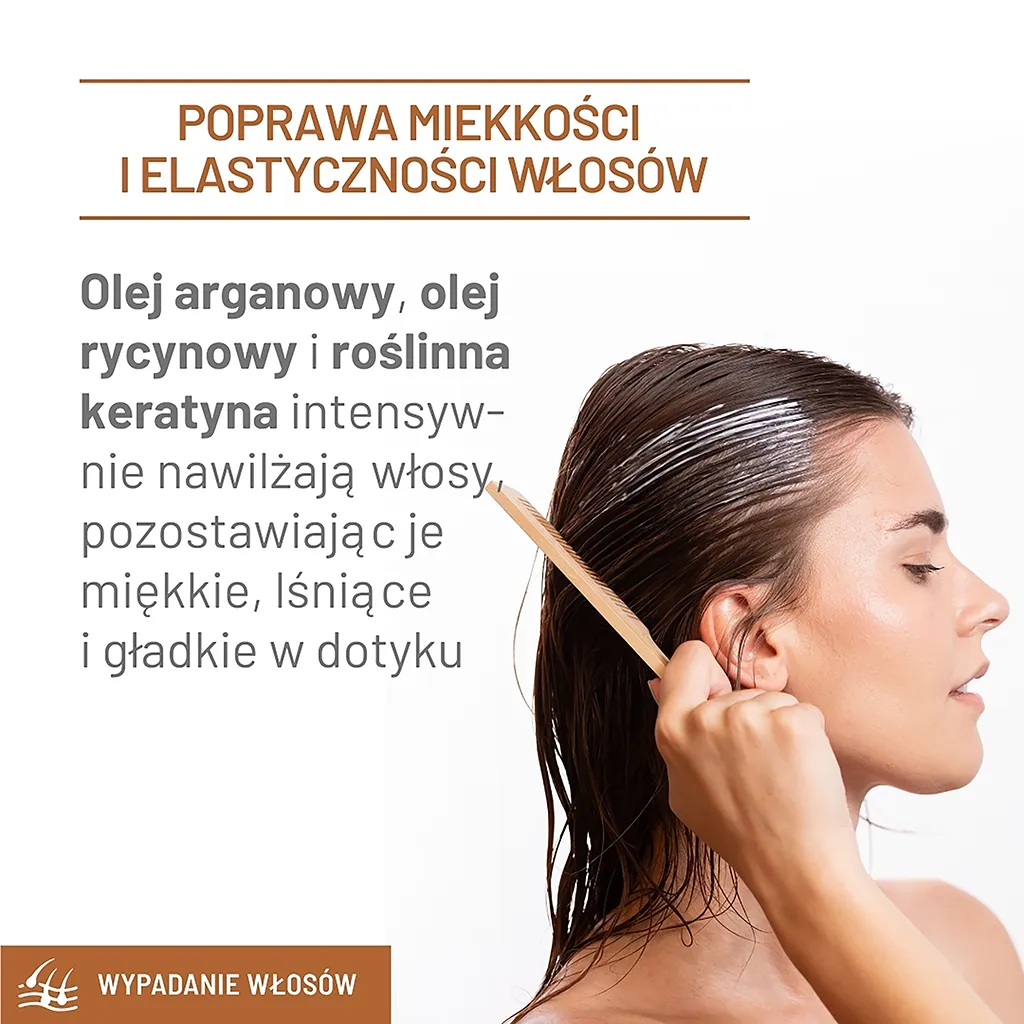 Maska do włosów i skóry głowy dla osób zmagających się z problemem wypadania włosów, przedwczesnym łysieniem. Dzięki zawartości oleju arganowego, oleju rycynowego i roślinnej keratyny, intensywnie nawilża włosy, pozostawiając je miękkie, lśniące i gładkie w dotyku. Biotyna ogranicza nadmierne wypadanie włosów, wspiera wzrost włosów, przyśpieszając tempo i dając efekt pełniejszej fryzury.