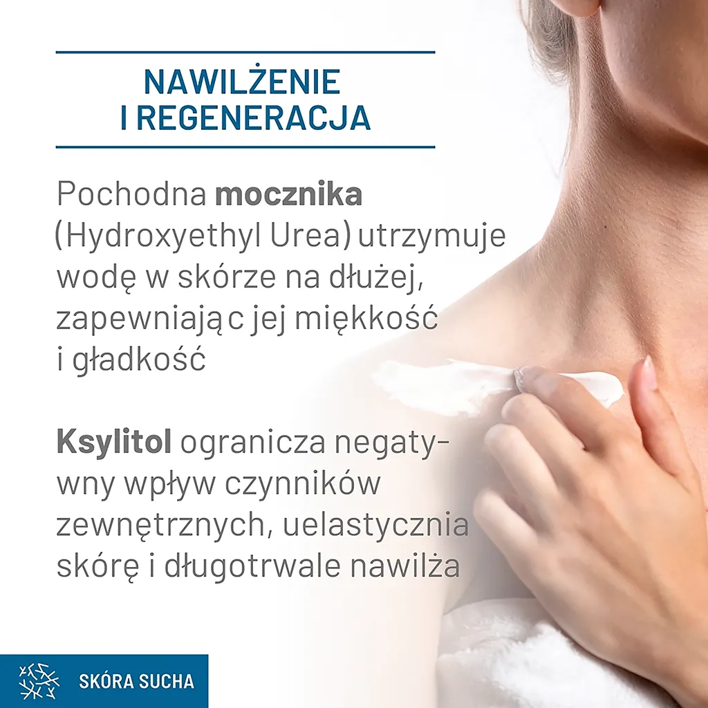 Nawilżający balsam do ciała został stworzony specjalnie dla osób mających skórę suchą, odwodnioną, wrażliwą, delikatną, z zaburzoną barierą hydrolipidową. Wyjątkowo skuteczna pochodna mocznika (Hydroxyethyl Urea) utrzymuje wodę w skórze na dłużej, zapewniając jej miękkość. Ksylitol ogranicza negatywny wpływ czynników zewnętrznych i zapewnia skórze długotrwałe nawilżenie.