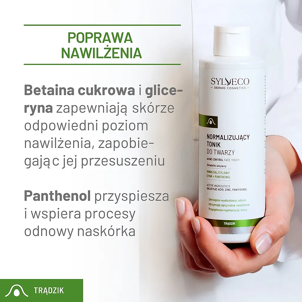 Betaina cukrowa i gliceryna zapewniają skórze odpowiedni poziom nawilżenia, zapobiegając jej przesuszeniu. Panthenol przyspiesza i wspiera procesy odnowy naskórka. Tonik zmniejsza ryzyko powstawania nowych zmian skórnych dzięki zawartości związków cynku. Delikatny zapach, oparty na kompozycji zapachowej bez alergenów sprawia, że codzienne stosowanie toniku jest niezwykle przyjemne.