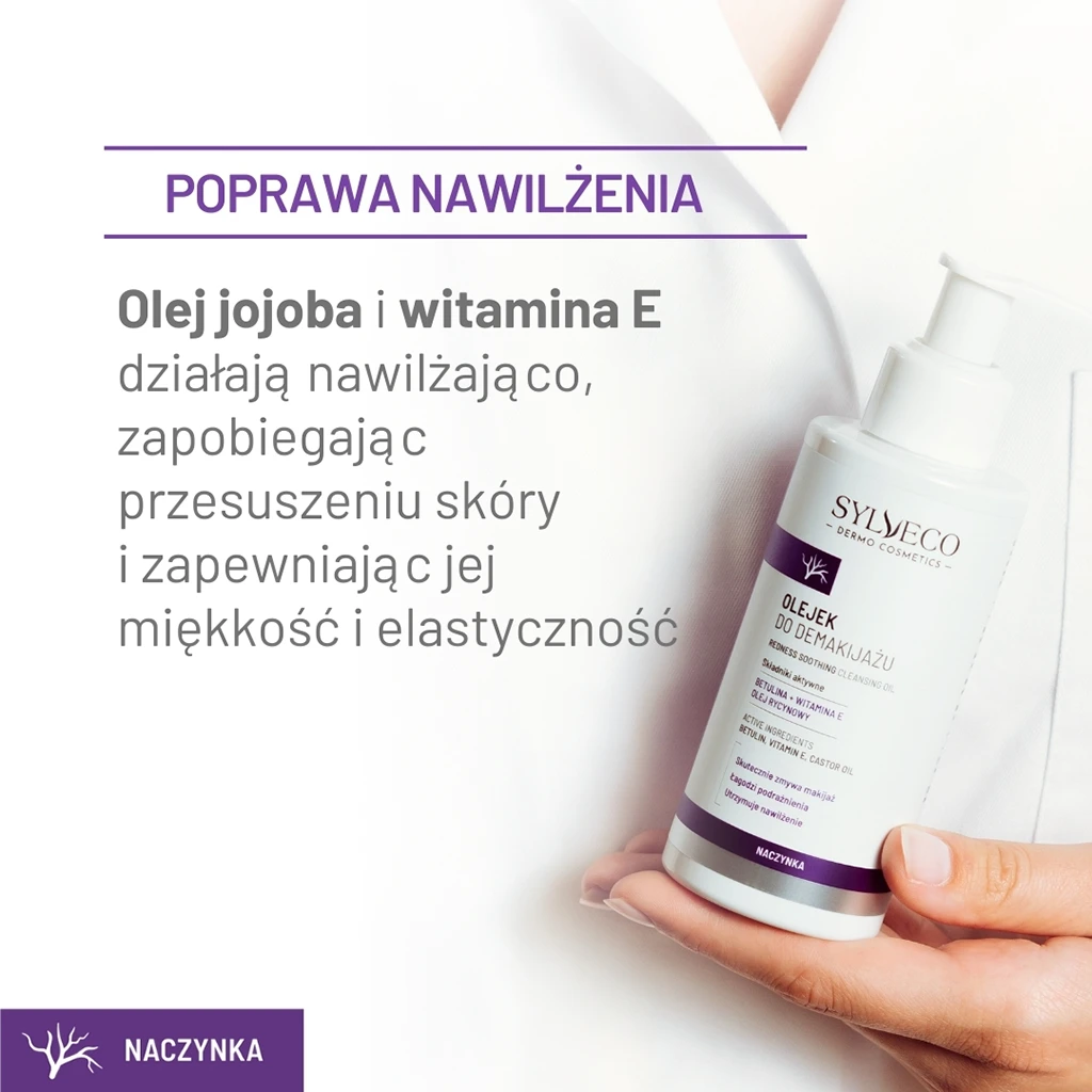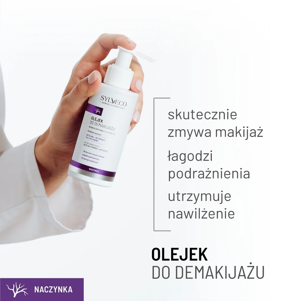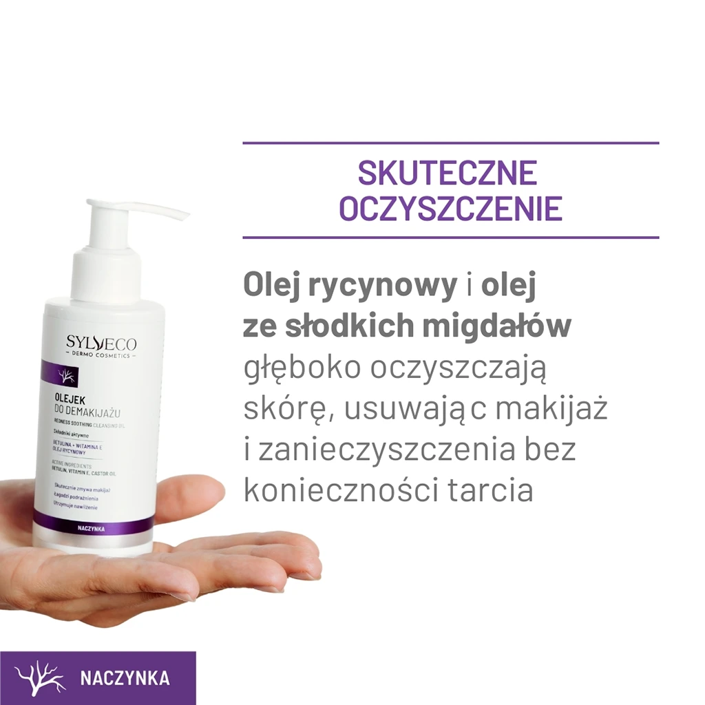 Olejek do demakijażu z linii SYLVECO DERMO to idealny kosmetyk dla osób walczących z niechcianym zaczerwienieniem, rumieniem, poszerzonymi naczynkami lub trądzikiem różowatym. Bazą produktu jest olej rycynowy i olej ze słodkich migdałów, które głęboko oczyszczają skórę, usuwając makijaż i zanieczyszczenia bez konieczności tarcia. Znana ze swoich właściwości ochronnych betulina łagodzi podrażnienia i przyczynia się do poprawy kondycji wrażliwej skóry.
