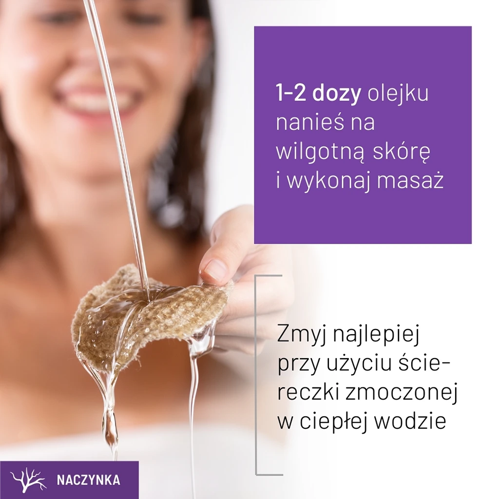 1-2 dozy olejku nanieś na wilgotną skórę i wykonaj masaż. Zmyj najlepiej przy użyciu ściereczki zmoczonej w ciepłej wodzie.