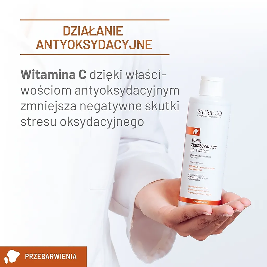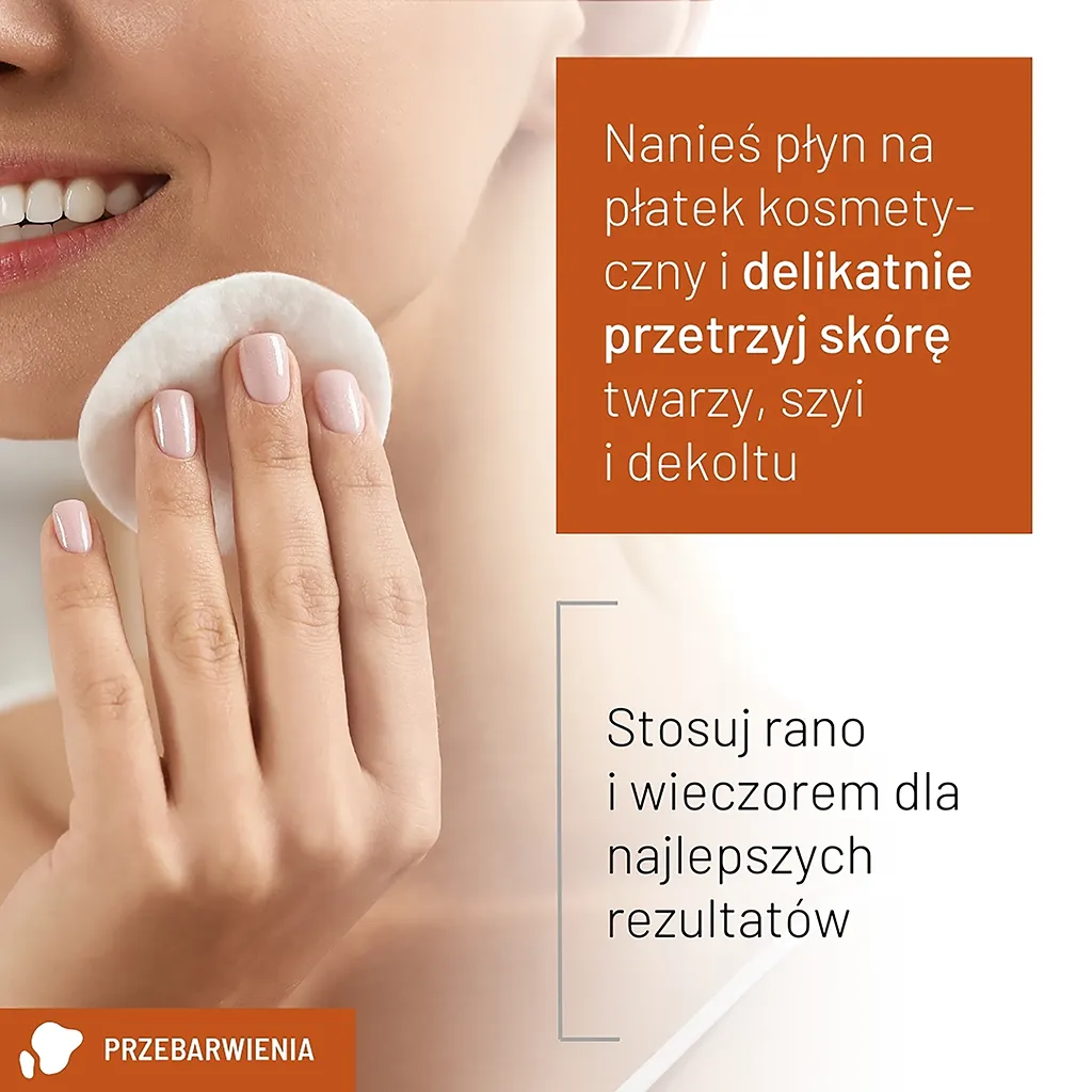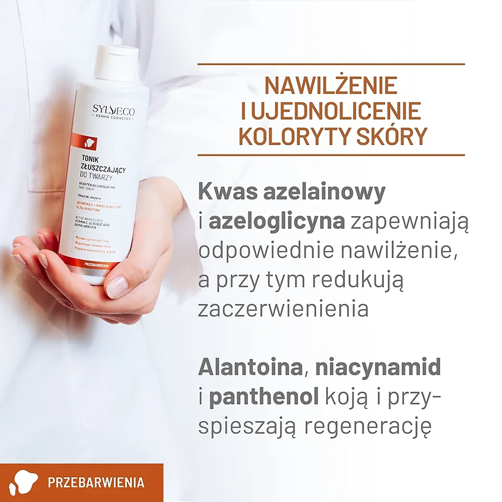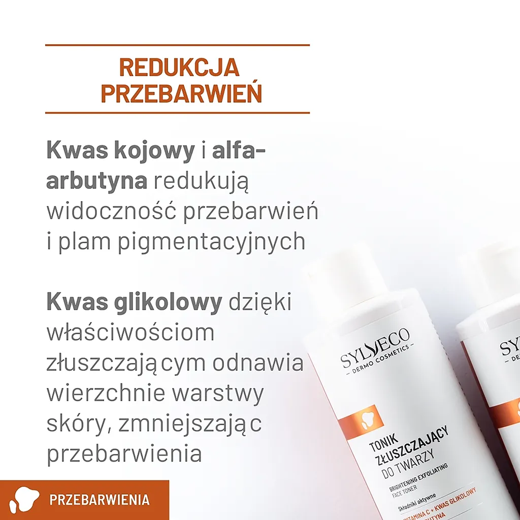 Złuszczający tonik do twarzy powstał z myślą o osobach zmagających się z przebarwieniami posłonecznymi, pozapalnymi, potrądzikowymi, zmianami barwnikowymi i nierównym kolorytem skóry. Zawarte w produkcie kwas kojowy i alfa-arbutyna redukują widoczność przebarwień i plam pigmentacyjnych. Kwas glikolowy dzięki właściwościom złuszczającym odnawia wierzchnie warstwy skóry, zmniejszając przebarwienia.