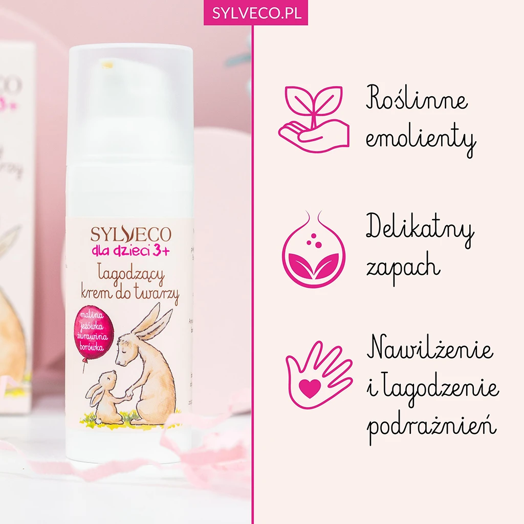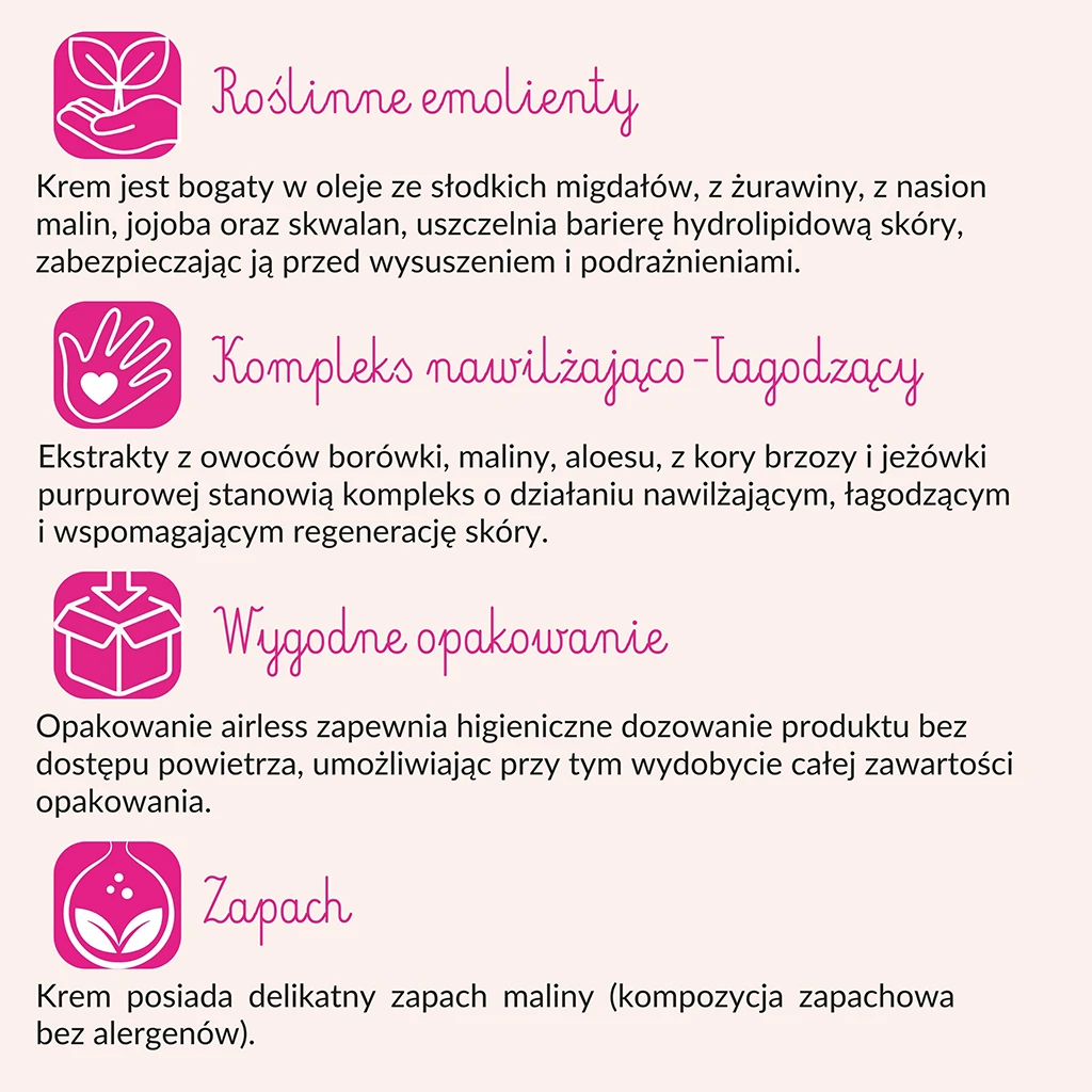 Nawilżający ochronno-odżywczy krem do twarzy do codziennej pielęgnacji delikatnej skóry dziecka. Bogaty w tłoczone na zimno oleje (ze słodkich migdałów, żurawinowy, z nasion malin, jojoba) skwalan i ceramidy uszczelnia barierę hydrolipidową skóry, zabezpieczając ją przed wysuszeniem i podrażnieniami. Antyoksydacyjne ekstrakty z owoców borówki, maliny, aloesu i jeżówki purpurowej stanowią kompleks o działaniu silnie łagodzącym, regenerującym i nawilżającym. Betulina, czyli ekstrakt z kory brzozy to składnik kojący, łagodzi objawy alergii, likwiduje swędzenie i zaczerwienienie skóry.