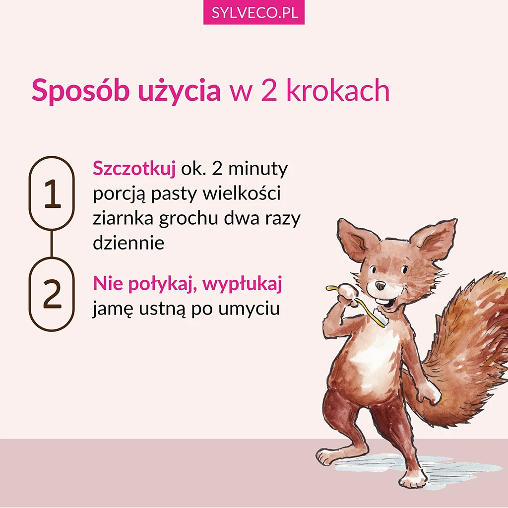 | Sposób użycia | Szczotkować ok. 2 minuty porcją pasty wielkości ziarnka grochu dwa razy dziennie. Nie połykać, po umyciu wypłukać jamę ustną. Stosować pod opieką dorosłego. |