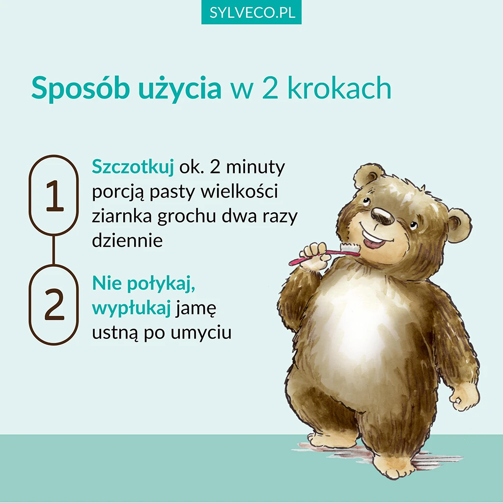 | Sposób użycia | Szczotkować ok. 2 minuty porcją pasty wielkości ziarnka grochu dwa razy dziennie. Nie połykać, po umyciu wypłukać jamę ustną. Stosować pod opieką dorosłego. |