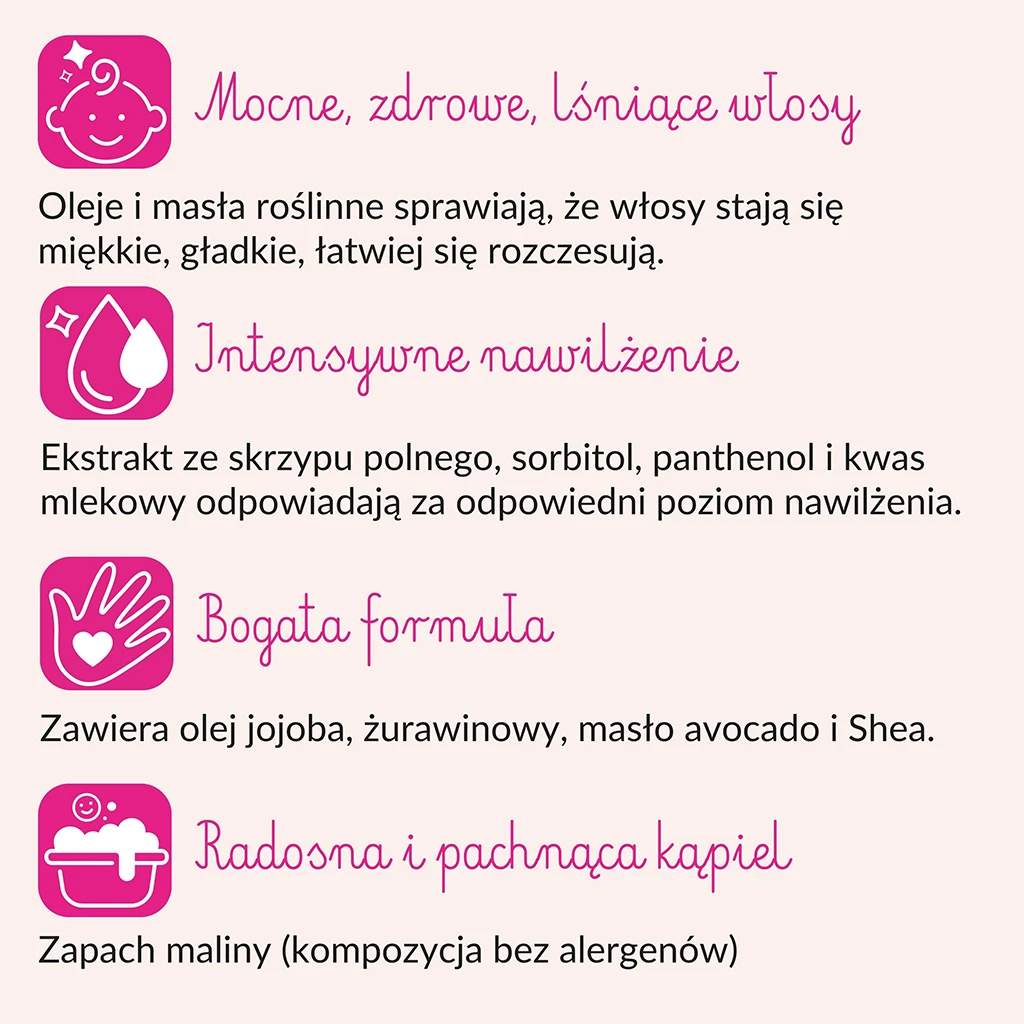 Naturalny szampon i odżywka 2 w 1 przeznaczony do mycia i pielęgnacji delikatnych włosów dzieci. Bogata formuła szamponu zawierająca oleje (jojoba, żurawinowy) oraz masła (avocado, shea sprawia, że skóra głowy zostaje skutecznie oczyszczona i jednocześnie optymalnie nawilżona. Ekstrakt ze skrzypu polnego oraz humektanty (sorbitol, panthenol, kwas mlekowy) sprawiają, że włosy rosną mocniejsze, zdrowsze i lśniące. Malinowy aromat kosmetyku i jego łagodna formuła, która nie szczypie w oczy.
