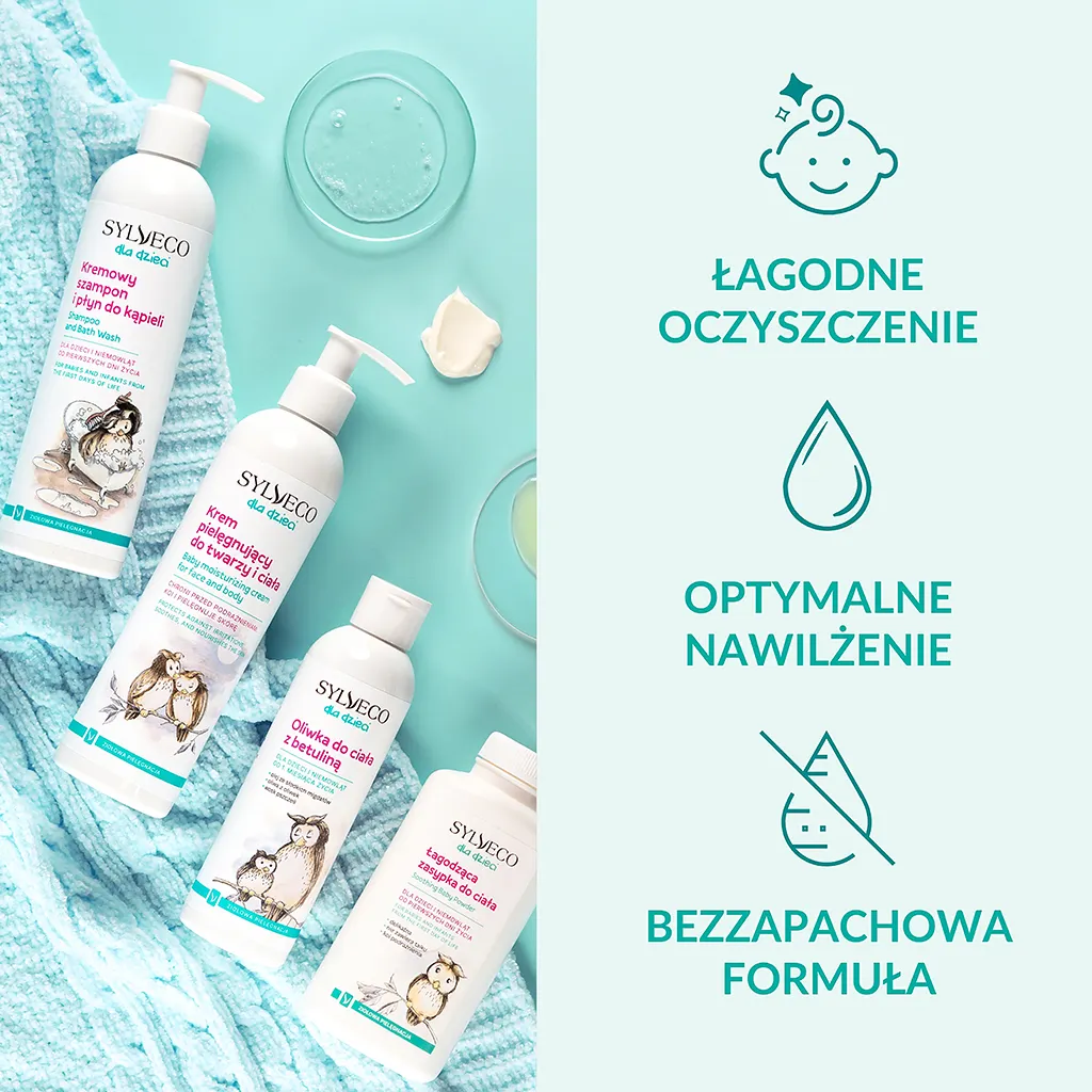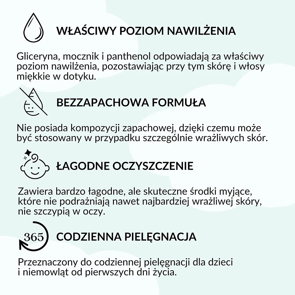 Naturalny, wyjątkowo delikatny, przeznaczony do codziennego mycia włosów oraz kąpieli niemowląt i dzieci. Zawiera bardzo łagodne, ale jednocześnie skuteczne środki myjące, które nie podrażniają nawet najbardziej wrażliwej skóry. Nie szczypie w oczy, pozostawia skórę i włosy miękkie w dotyku. Połączenie składników nawilżających i natłuszczających gwarantuje utrzymanie naturalnej bariery ochronnej i zapobiega utracie wody.