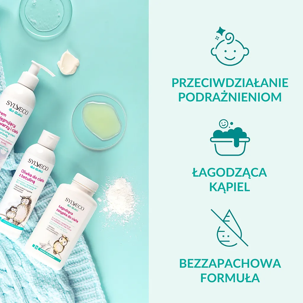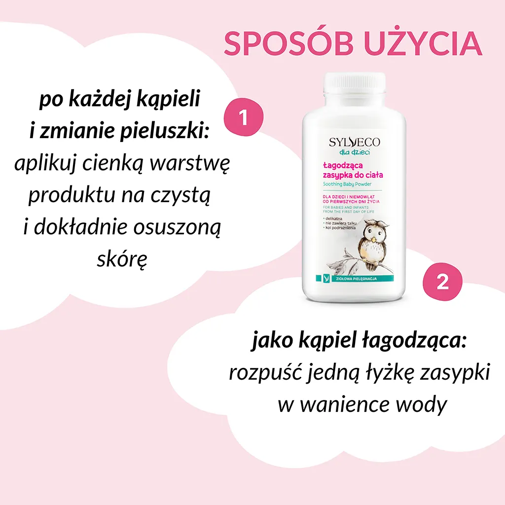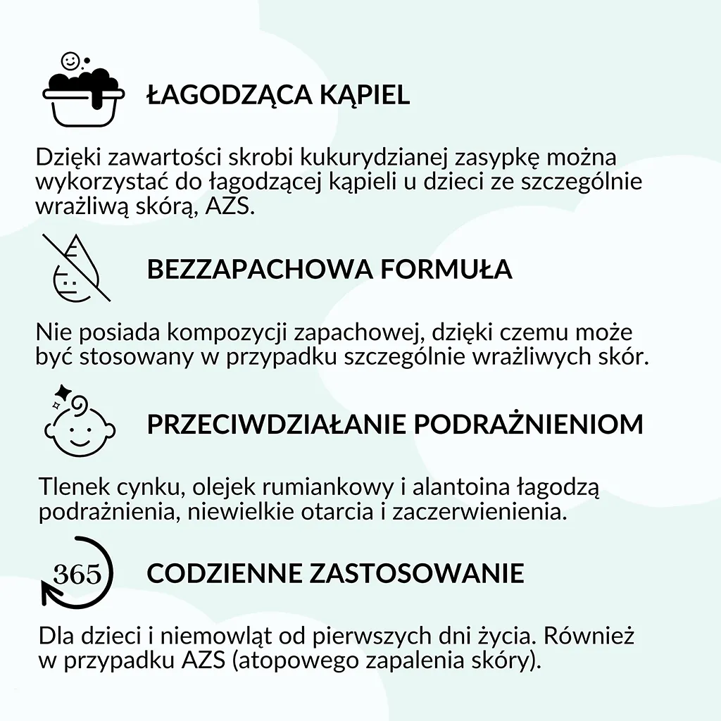Naturalna zasypka do ciała skutecznie pielęgnuje delikatną skórę dziecka. Skrobia kukurydziana, główny składnik pudru, absorbuje wilgoć, tlenek cynku przeciwdziała podrażnieniom, a olejek rumiankowy i alantoina intensywnie regenerują. Zasypkę można także zastosować do łagodzącej kąpieli u dzieci z nadwrażliwą skórą.