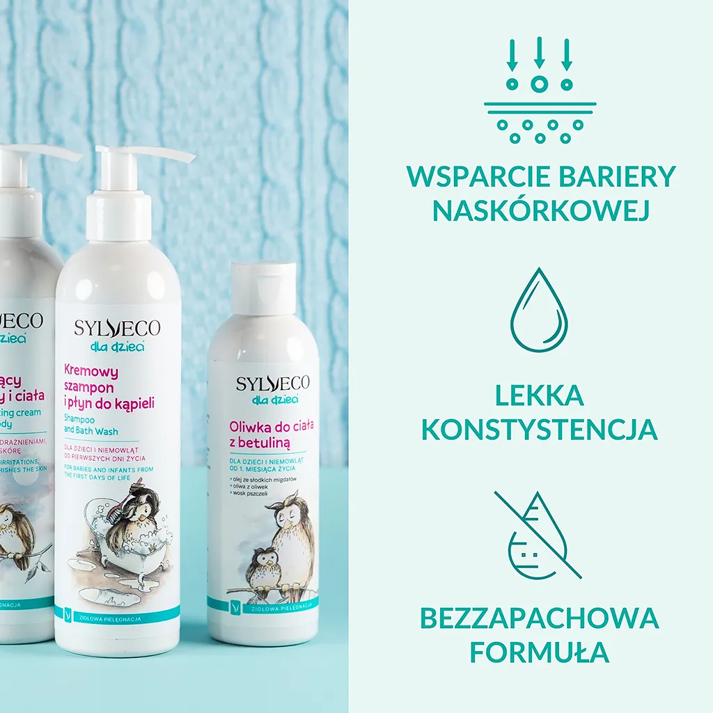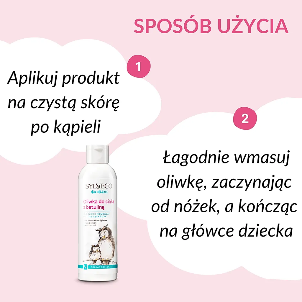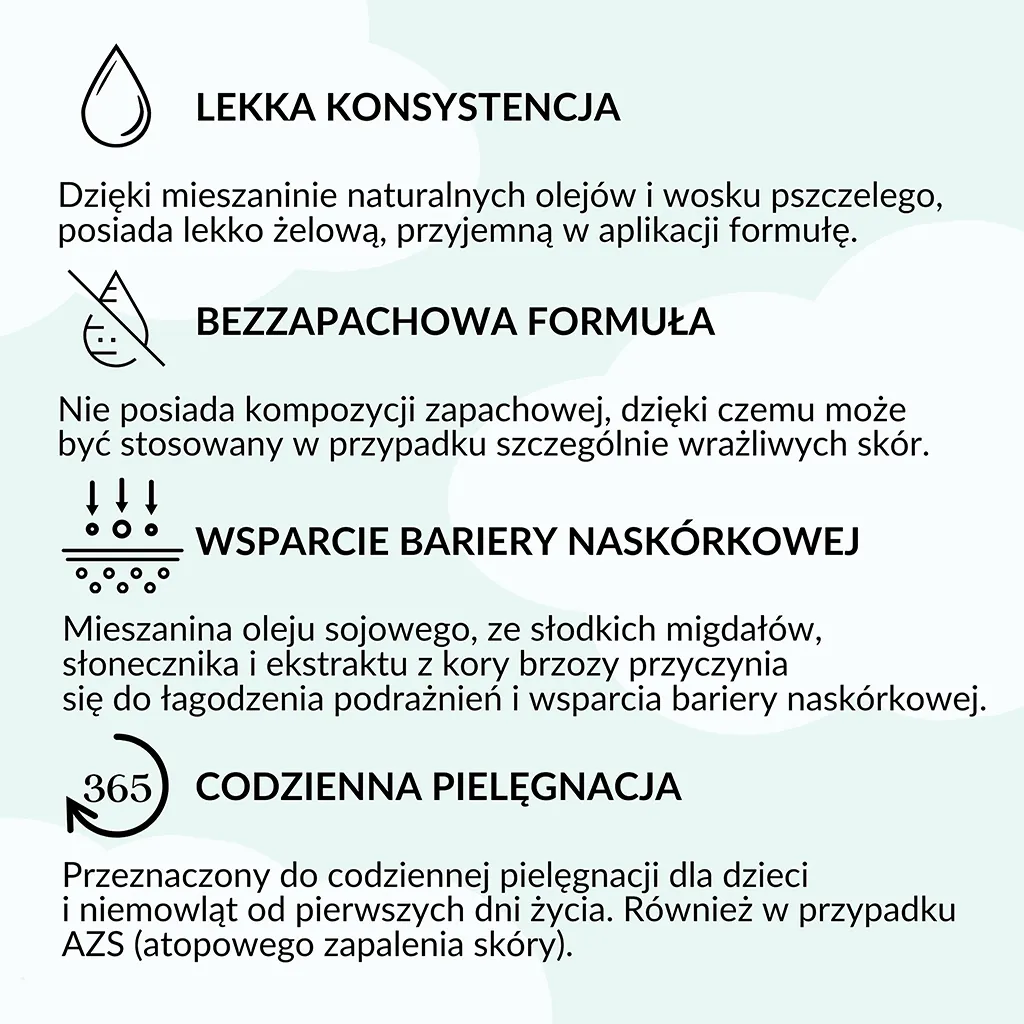Hipoalergiczna oliwka do ciała stanowi specjalnie skomponowaną mieszankę naturalnych olejów roślinnych i wosku, dzięki czemu zyskuje lekko żelową formułę, łatwą i przyjemną w aplikacji. Ekstrakt z kory brzozy (betulina) to składnik łagodzący, likwiduje objawy swędzenia i zaczerwienienia skóry. Oliwka skutecznie natłuszcza delikatną skórę dziecka, zapobiegając utracie wilgoci, szczególnie w przypadku nadwrażliwych i nadreaktywnych skór. Odpowiednia konsystencja ułatwia wykonanie nawilżającego masażu u niemowląt i dzieci, dzięki czemu umacnia się nasza więź z maluszkiem.