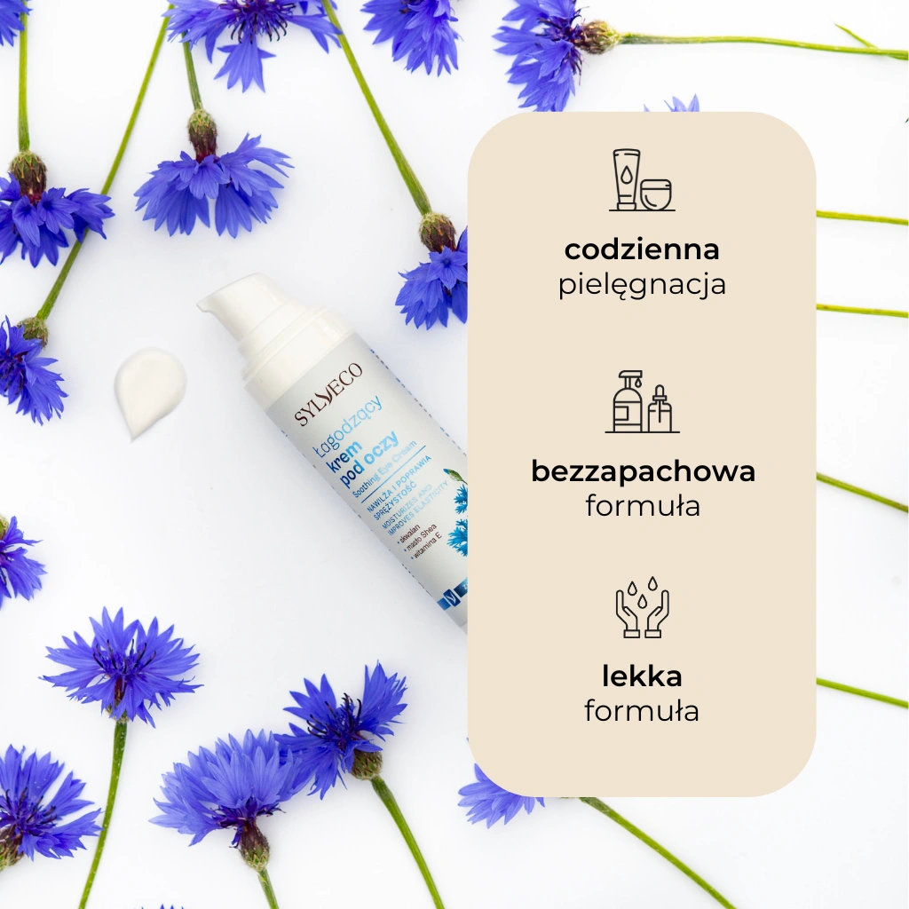 Naturalny, łagodzący krem pod oczy przeznaczony jest do codziennej pielęgnacji wrażliwej i delikatnej skóry wokół oczu. W jego składzie znalazły się ekstrakty z kory brzozy, chabru bławatka oraz świetlika, które działają łagodząco, kojąco i zmniejszają obrzęki. Dzięki specjalnie dobranej, bezzapachowej formule, krem poprawia strukturę skóry, przywracając jej właściwy poziom nawilżenia oraz sprężystość. Usuwa objawy zmęczenia i zaczerwienienia, hamuje procesy starzenia się skóry.
