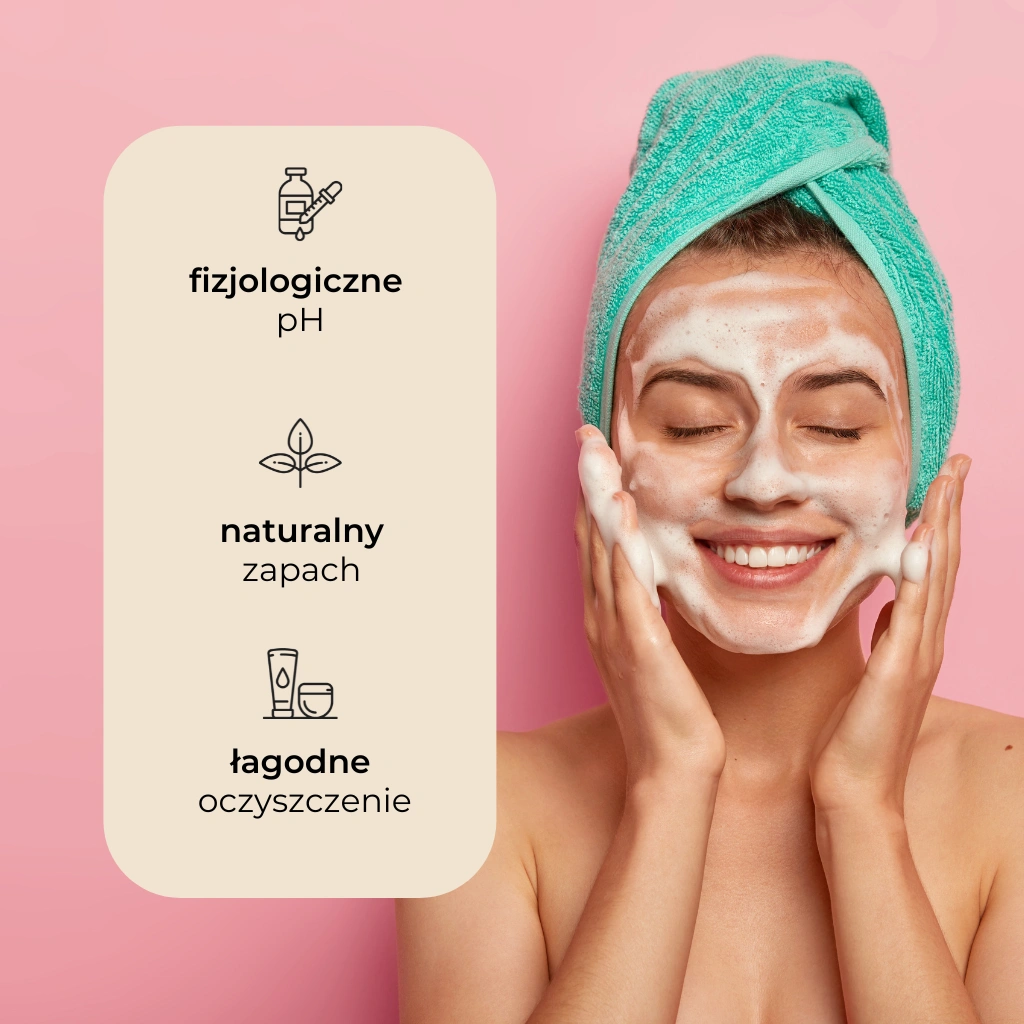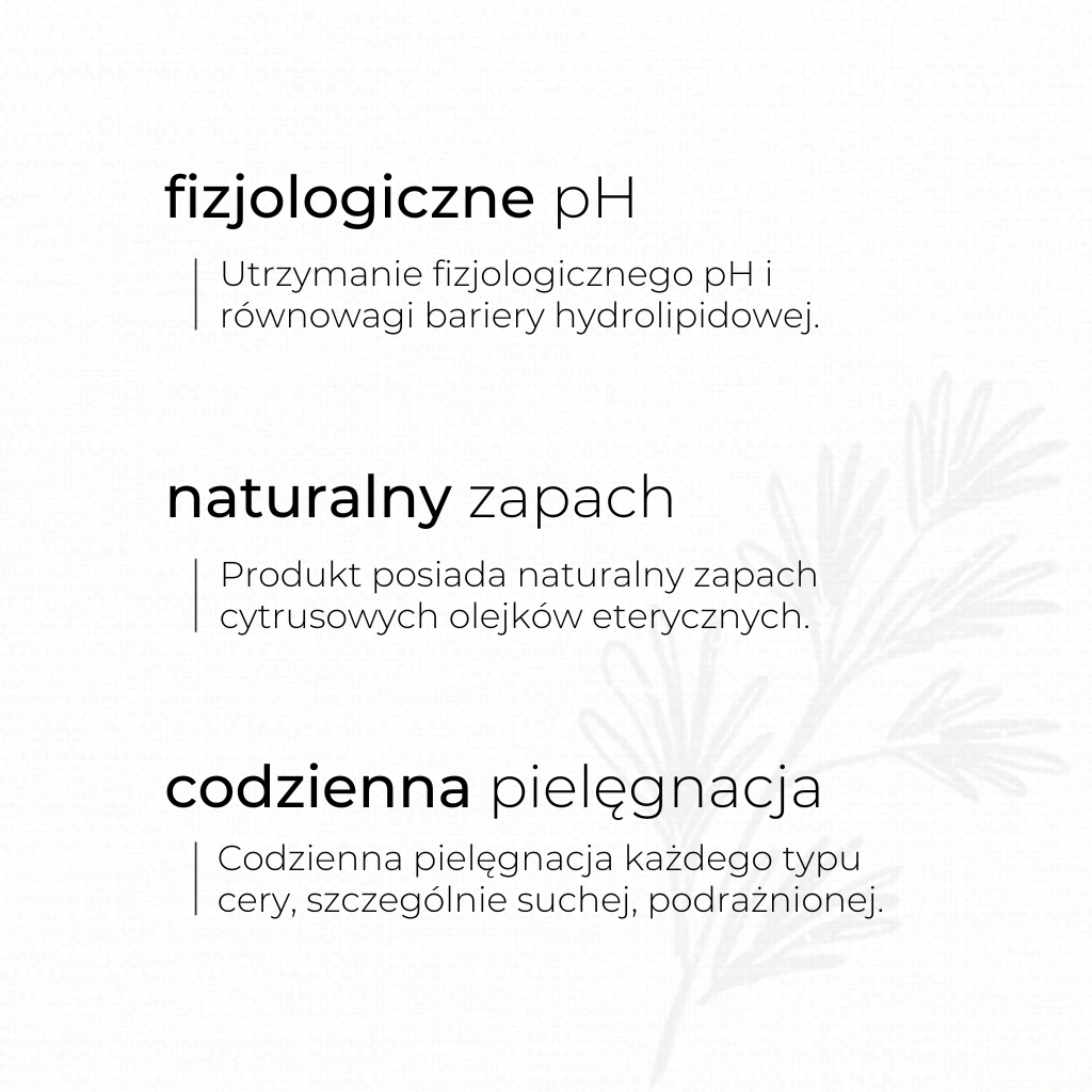 Zawiera bardzo łagodne środki myjące, które skutecznie oczyszczają i nie podrażniają nawet najbardziej wrażliwej skóry. Ekstrakt z nagietka lekarskiego, łagodzi podrażnienia, a dodatek kwasu mlekowego gwarantuje utrzymanie fizjologicznego pH i równowagi bariery hydrolipidowej. W produkcie zastosowano cytrusowe olejki eteryczne, dzięki którym pianka posiada naturalny, świeży zapach.
