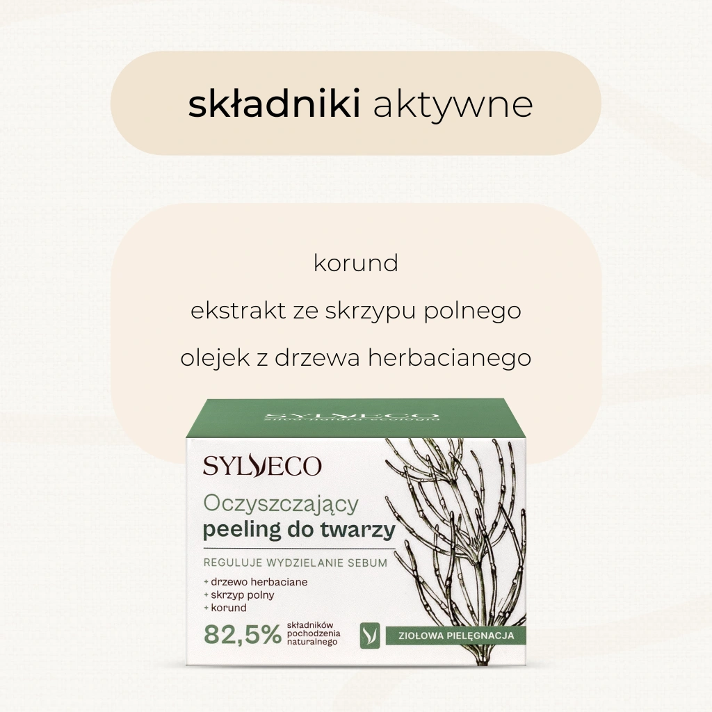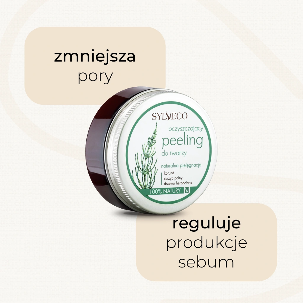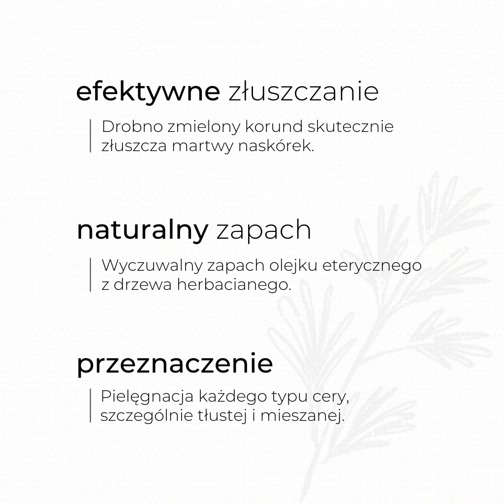 Naturalny, kremowy peeling z korundem przeznaczony do oczyszczania skóry ze skłonnością do przetłuszczania, z rozszerzonymi porami. Drobinki ścierające są mocne i doskonale złuszczają martwy naskórek. Peeling zawiera ekstrakt ze skrzypu polnego o działaniu normalizującym pracę gruczołów łojowych, łagodzącym podrażnienia i przyspieszającym regenerację. Stosowany systematycznie dotlenia skórę, poprawia jej ogólny stan, zmniejsza pory i reguluje wydzielanie sebum.
