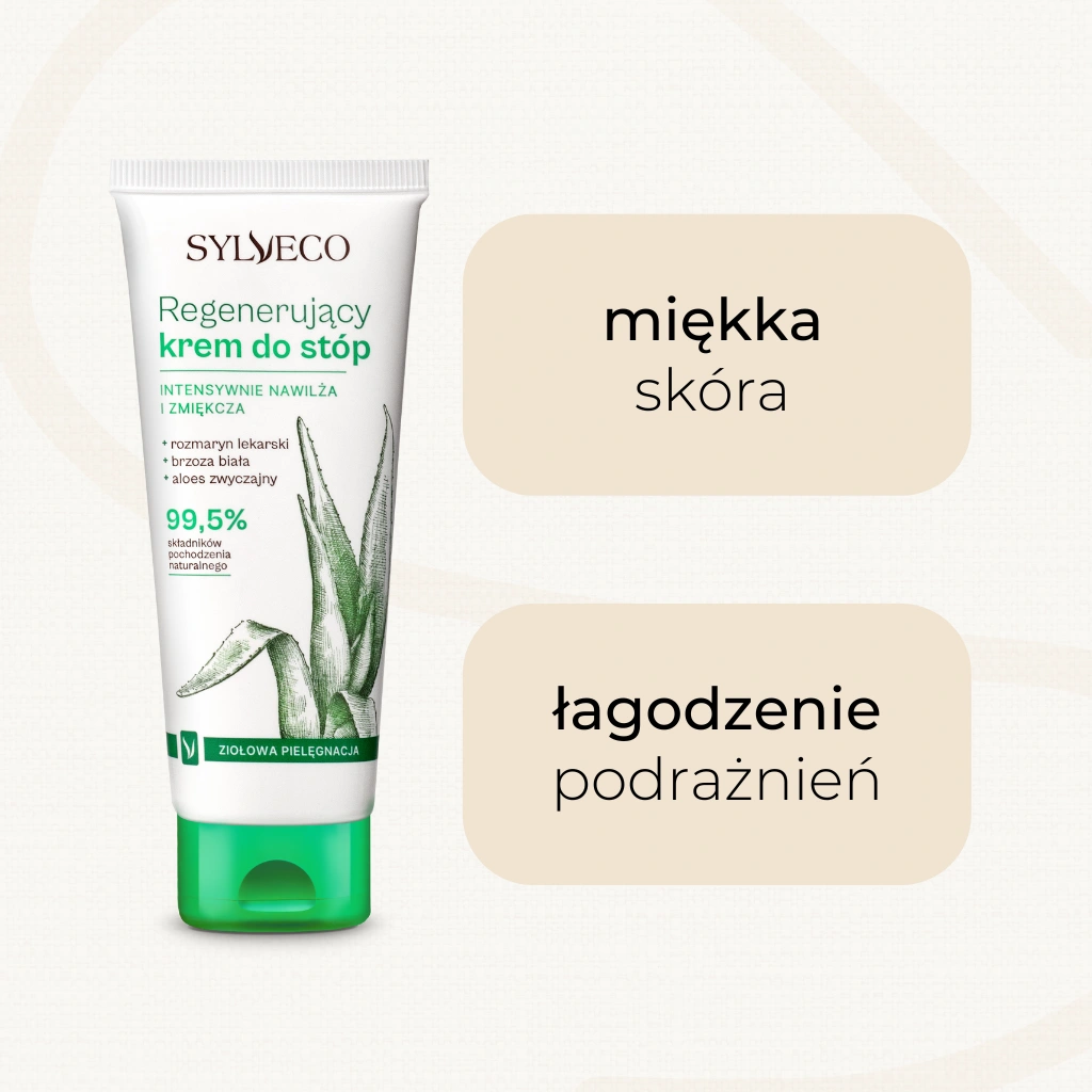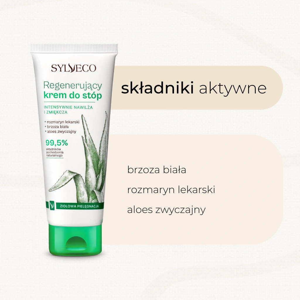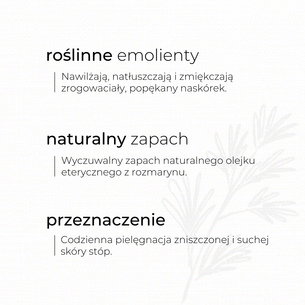 Naturalny, regenerujący krem do stóp, zawierający tylko naturalne składniki, przeznaczony jest do codziennej pielęgnacji suchej i zniszczonej skóry. Intensywnie i głęboko nawilża, natłuszcza i zmiękcza zrogowaciały, popękany naskórek. W skład kremu wchodzą roślinne ekstrakty aloesu oraz brzozy, które łagodzą podrażnienia, a olejek rozmarynowy działa kojąco i odświeża skórę.