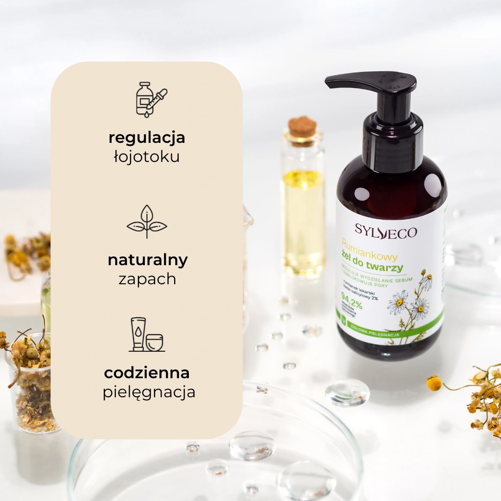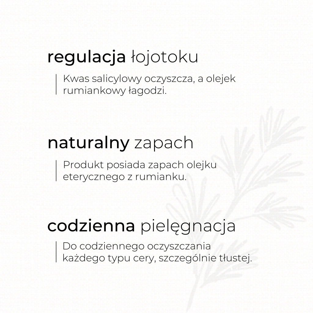 Naturalny, głęboko oczyszczający żel do mycia twarzy z kwasem salicylowym (2%) o aktywnym działaniu kojącym i łagodzącym. Zawiera bardzo łagodny, ale jednocześnie skuteczny środek myjący, który nie podrażnia nawet najbardziej wrażliwej skóry. Usuwa zanieczyszczenia i nadmiar sebum, odblokowuje pory i reguluje procesy odnowy naskórka. Żel został wzbogacony olejkiem eterycznym z rumianku, który posiada właściwości regenerujące i łagodzące. Systematyczne stosowanie pozwala zachować gładką, miękką, zdrową skórę.