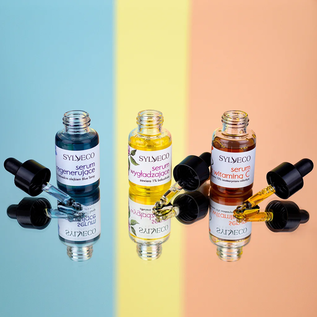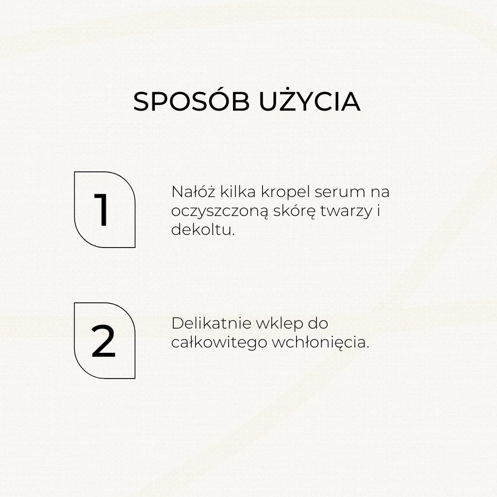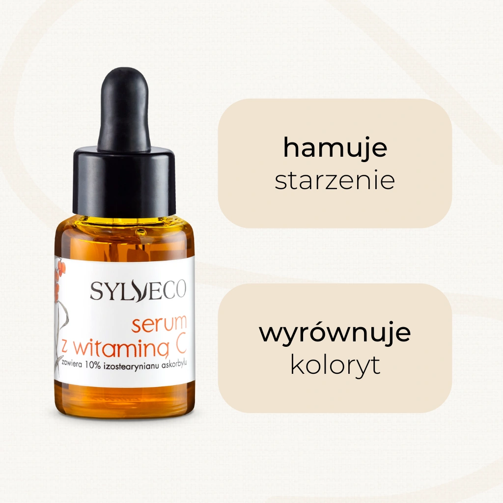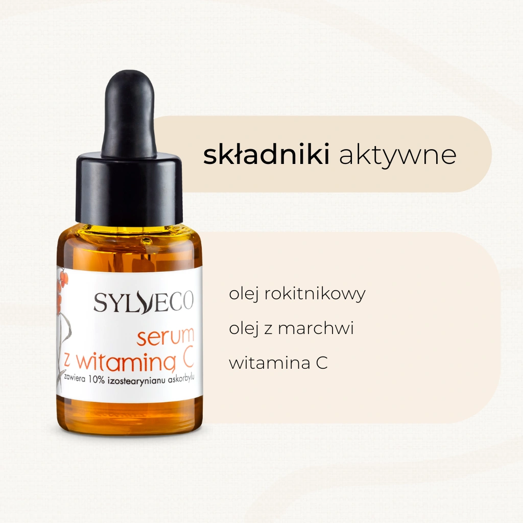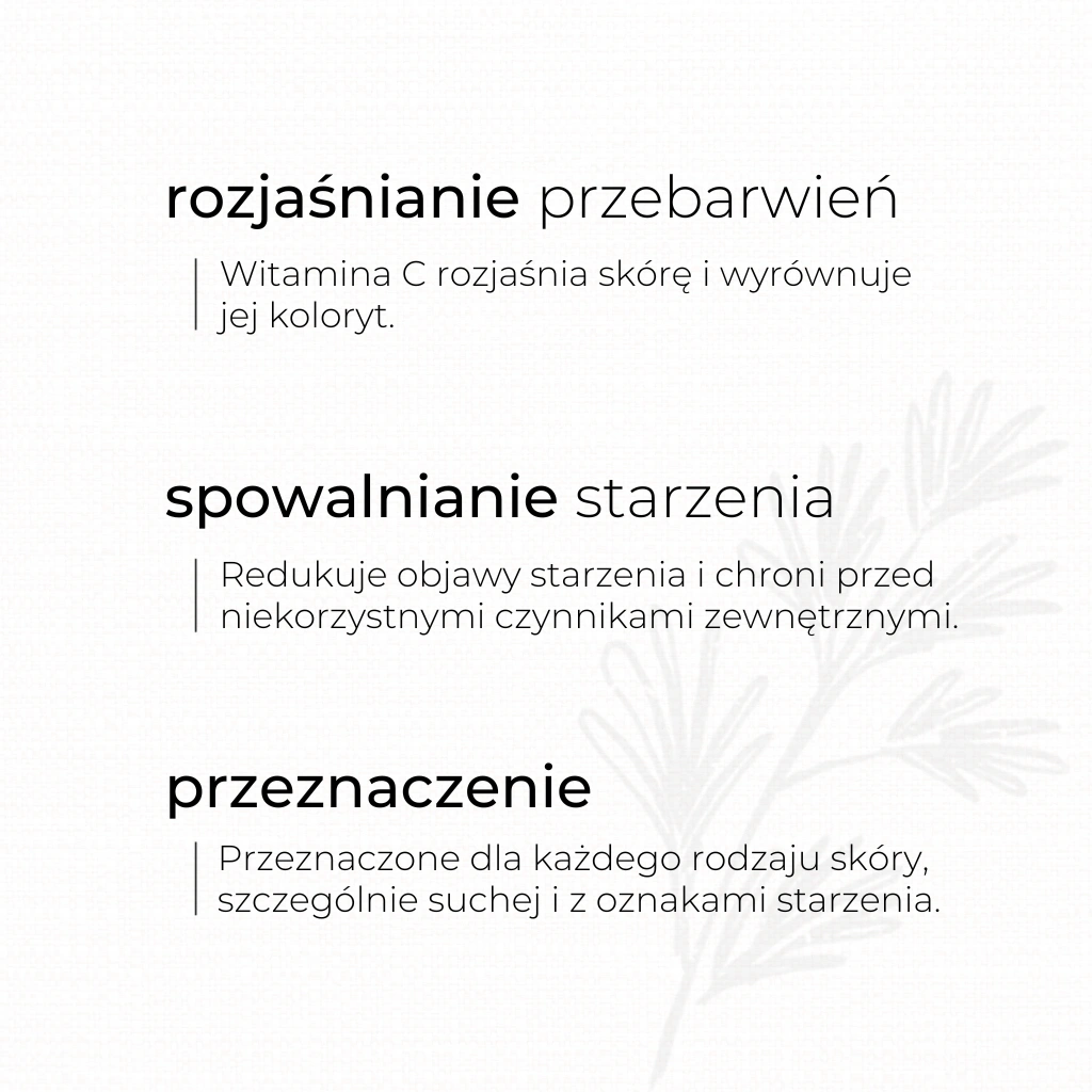Rozjaśniające serum dzięki wysokim stężeniom aktywnych składników redukuje proces starzenia się skóry oraz chroni przed działaniem niekorzystnych czynników zewnętrznych (stres, zanieczyszczenia środowiska, dym tytoniowy), w tym skutkami promieniowania UV. Serum zawiera aż 10% stabilnej postaci witaminy C, pochodnej izostearynianu askorbylu, która rozjaśnia cerę, wyrównuje koloryt i regeneruje, przywracając skórze zdrowy, piękny blask oraz witalność. Cera po użyciu pozostaje zauważalnie nawilżona, odżywiona i ujędrniona dzięki kompozycji wyjątkowych roślinnych składników: oleju rokitnikowego, oleju z nasion marchwi, oleju z czarnej porzeczki, oleju z pachnotki, oleju z pestek moreli oraz oleju z kiełków pszenicy.