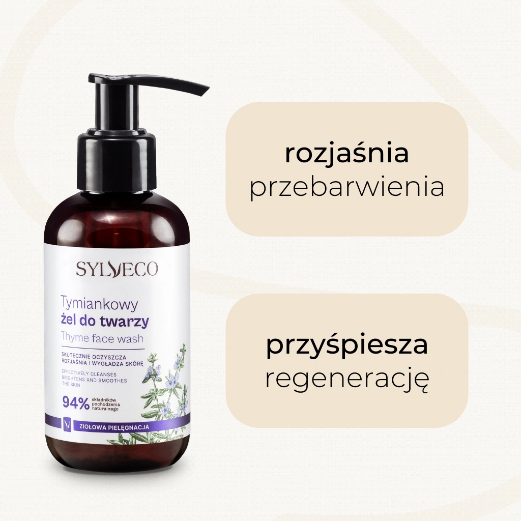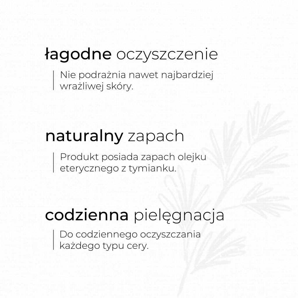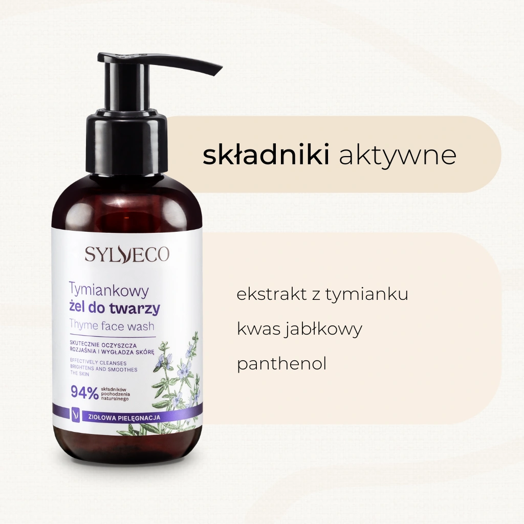 Naturalny, oczyszczający żel do mycia twarzy z kwasem jabłkowym o aktywnym działaniu wygładzającym i rozjaśniającym. Zawiera bardzo łagodny, ale jednocześnie skuteczny środek myjący, który nie podrażnia nawet najbardziej wrażliwej skóry. Usuwa zanieczyszczenia i nadmiar sebum, delikatnie złuszcza martwy naskórek i reguluje procesy odnowy jego komórek. Żel został wzbogacony olejkiem i ekstraktem z tymianku, które posiadają właściwości kojące. Systematyczne stosowanie pozwala zachować gładką, zdrową skórę o równomiernym kolorycie.