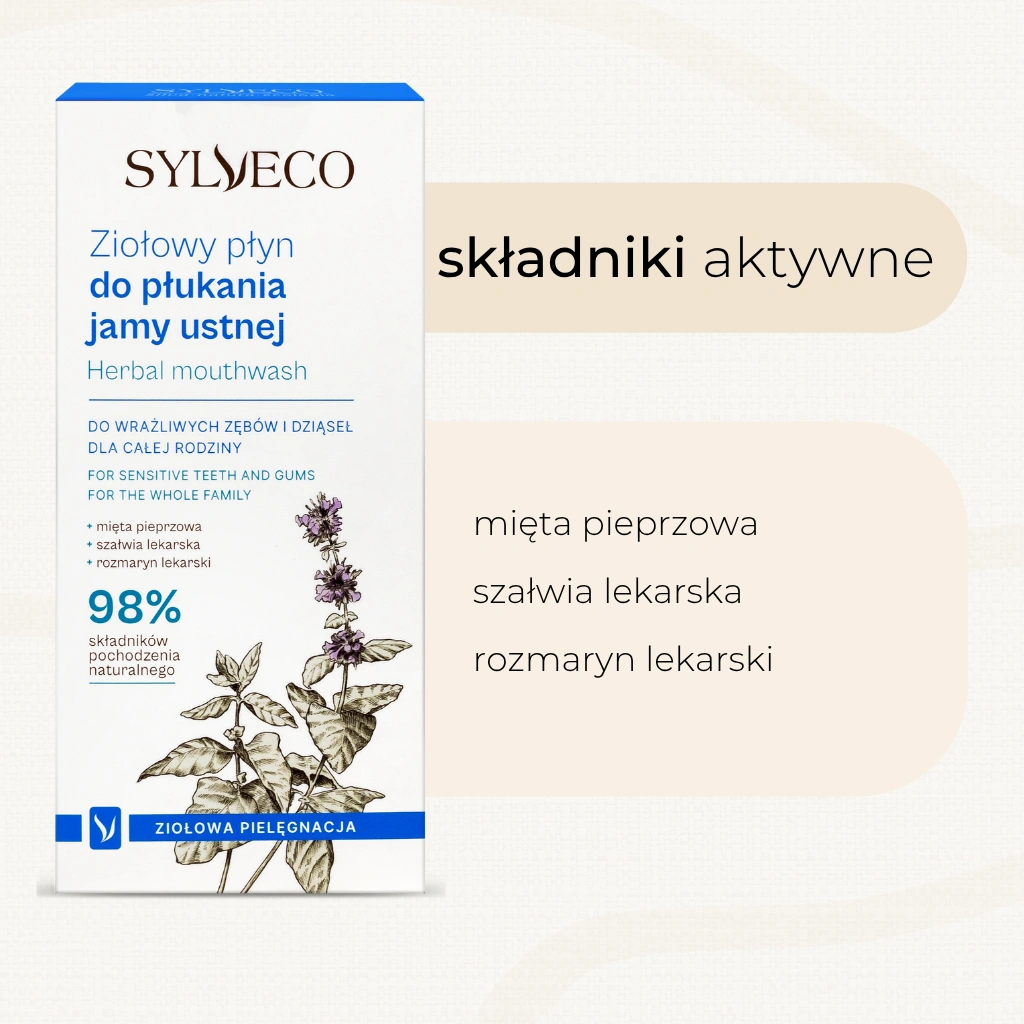 Naturalny, ziołowy płyn do płukania jamy ustnej. Zawiera odświeżające ekstrakty z szałwii, mięty, rozmarynu, goździków oraz łagodzącą alantoinę. Szybko i skutecznie oczyszcza z resztek pokarmowych, a dzięki zawartości olejku eterycznego z mięty pieprzowej mocno odświeża oddech i zapobiega powstawaniu osadu. Ksylitol (cukier brzozowy) pozwala utrzymać prawidłowe środowisko, wzmacnia szkliwo i przeciwdziała powstawaniu ubytków. Płyn nie zawiera składników drażniących, może być stosowany przez osoby z nadwrażliwością dziąseł i zębów.