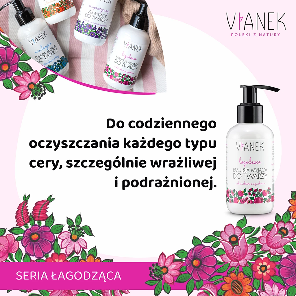 Kremowa emulsja do mycia twarzy, przeznaczona do cery wrażliwej, skłonnej do podrażnień. Delikatnie i skutecznie usuwa zanieczyszczenia, nie naruszając jednocześnie bariery lipidowej skóry. Zawiera kompleks składników łagodzących (alantoina, panthenol) i powlekających, w tym ekstrakt z korzenia żywokostu o silnych właściwościach regenerujących. Dodatek oleju kokosowego nawilża i odżywia, zwiększając elastyczność skóry. Emulsja po umyciu twarzy pozostawia przyjemne uczucie czystości, miękkości i gładkości.