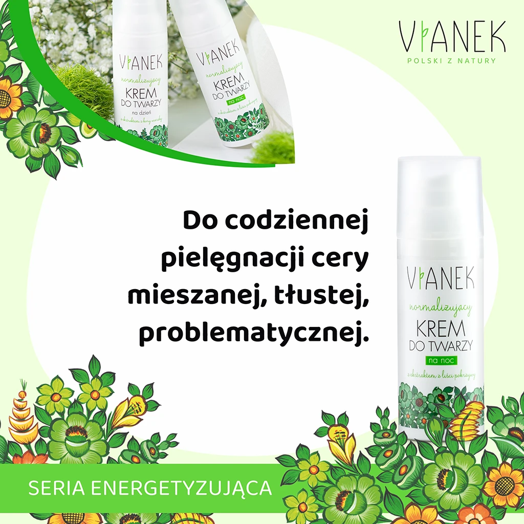 Krem normalizujący do wieczornej pielęgnacji cery przetłuszczającej się i problematycznej. Łagodzi podrażnienia i intensywnie wspomaga procesy regeneracyjne. Zawiera kompleks składników regulujących (bio-siarkę, ekstrakt z pokrzywy, witaminę B3, olejek z drzewa herbacianego i betulinę), które ograniczają powstawanie wyprysków, zmniejszają produkcję sebum i normują procesy łuszczenia. Krem stanowi idealne wsparcie w walce z niedoskonałościami.