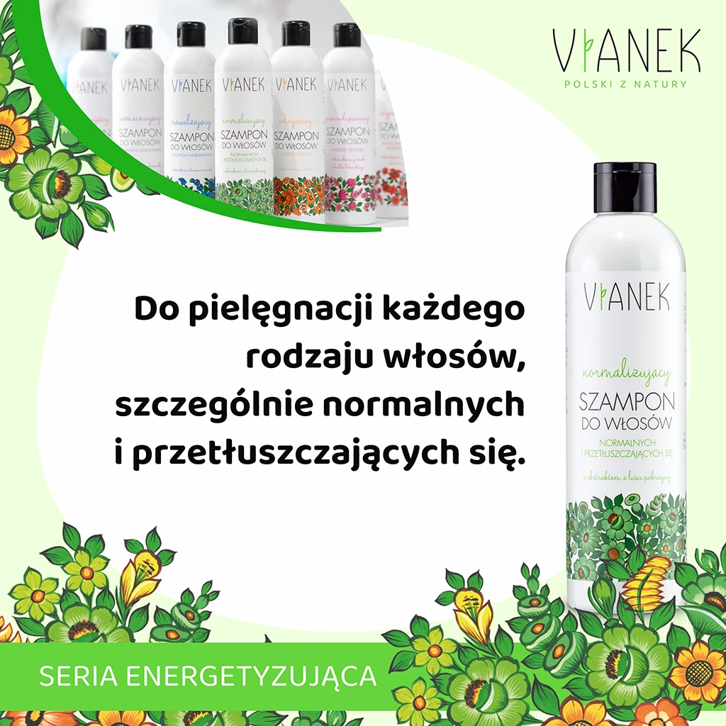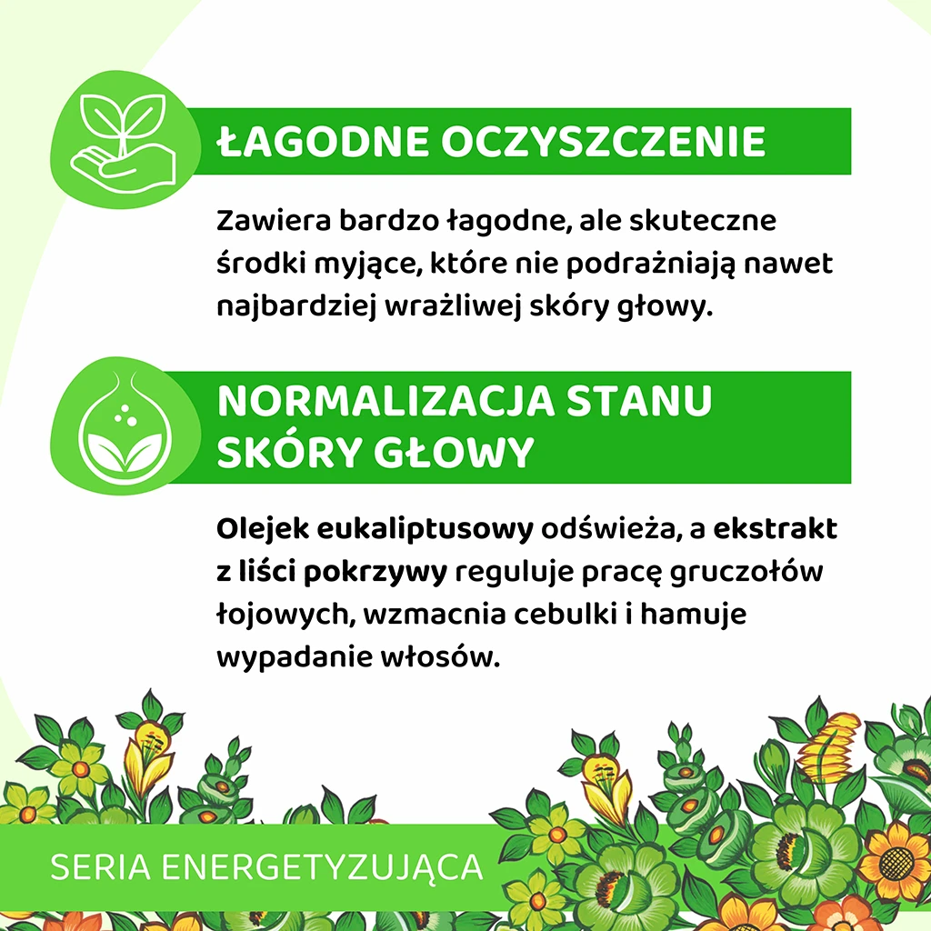Delikatny szampon do codziennego mycia włosów normalnych i przetłuszczających się. Zawiera ekstrakt z liści pokrzywy zwyczajnej o działaniu regulującym pracę gruczołów łojowych, wzmacnia jednocześnie cebulki i hamuje wypadanie włosów. Olejek eukaliptusowy odświeża i tonizuje skórę głowy, a panthenol i kwas mlekowy nawilżają, zapewniając włosom miękkość, gładkość i elastyczność.