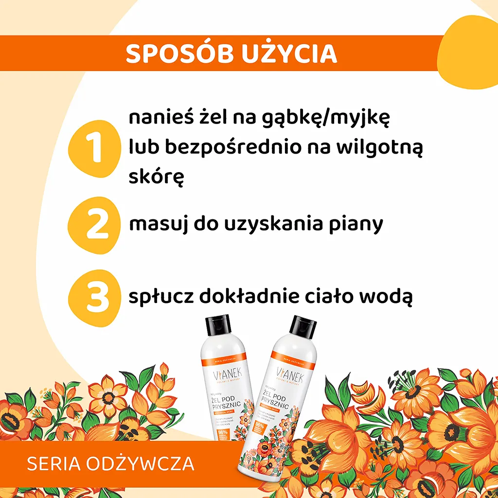 | Sposób użycia | Nanieś żel na gąbkę/myjkę lub bezpośrednio na wilgotną skórę i masuj do uzyskania piany. Następnie spłucz dokładnie ciało wodą. |
