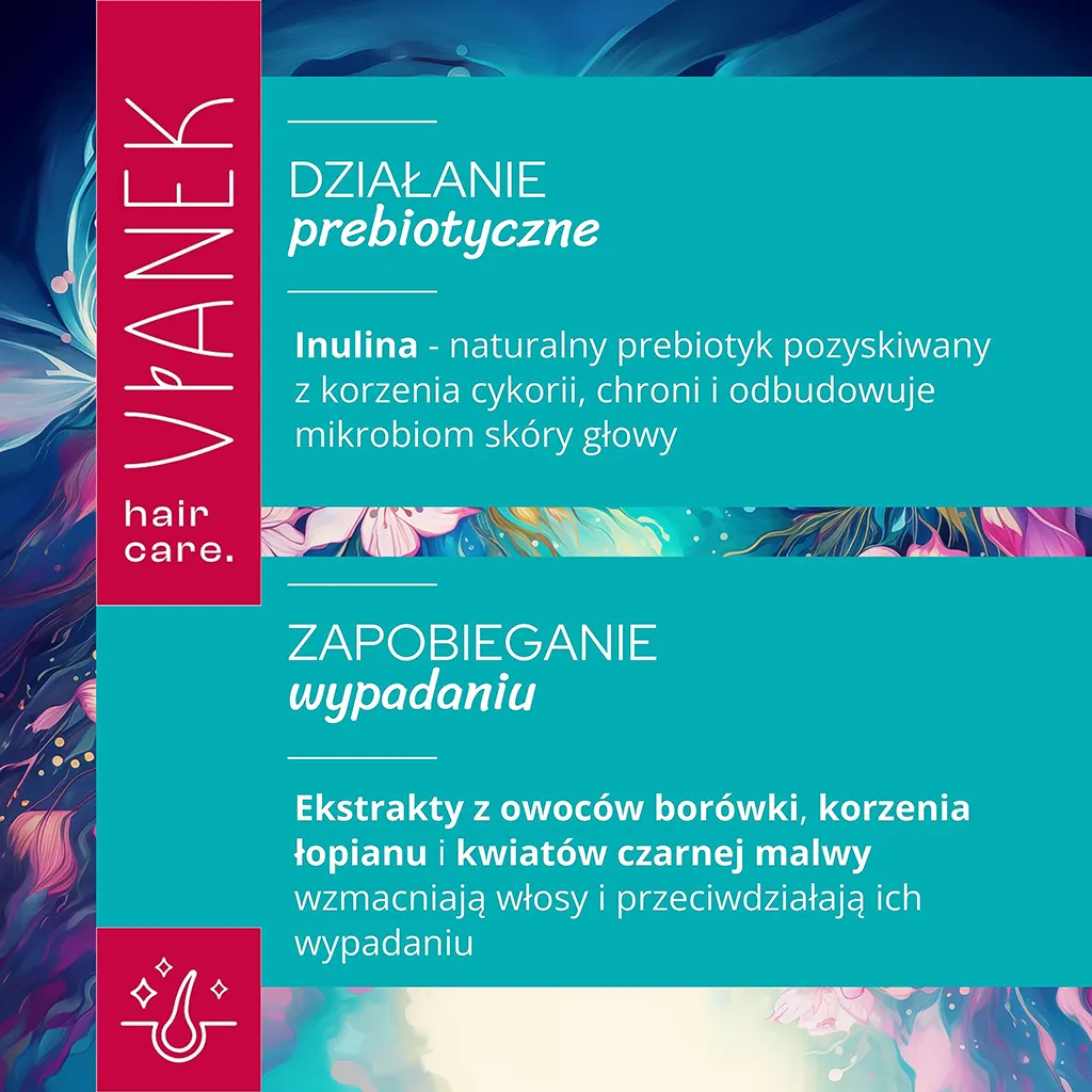 • Nasza odżywka wykorzystuje moc inuliny, cennego naturalnego prebiotyku pozyskiwanego z korzenia cykorii. Inulina intensywnie nawilża włosy oraz odbudowuje mikrobiom skóry głowy, poprawiając jej kondycję i zapewniając idealne warunki do wzrostu silnych i zdrowych włosów.