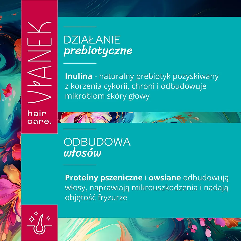 - Bazę naszej odżywki stanowi inulina, cenny naturalny prebiotyk pozyskiwany z korzenia cykorii. Działa na głębokim poziomie, intensywnie nawilżając włosy i odbudowując mikrobiom skóry głowy, co jest kluczowe dla utrzymania zdrowia i witalności włosów.