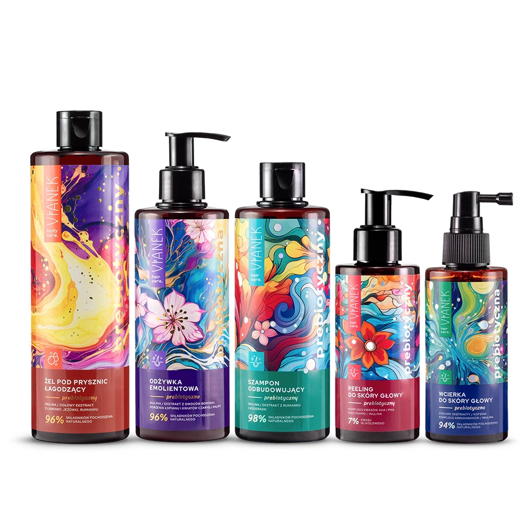 Poznaj moc prebiotyków z wyjątkowym zestawem VIANEK Prebiotyczny odbudowującym włosy i wzmacniającym skórę całego ciała! Dzięki naszej specjalnie opracowanej formule, wykorzystującej siłę prebiotyków, zapewnisz kompleksowe odżywienie i wzmocnienie skóry głowy, odbudowę włosów oraz nawilżenie skóry całego ciała. Produkty z linii VIANEK Prebiotyczny to wsparcie dla mikrobiomu skóry, głębokie nawilżenie, regeneracja, łagodzenie podrażnień oraz opóźnienie procesów starzenia.