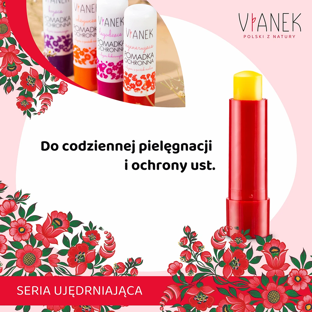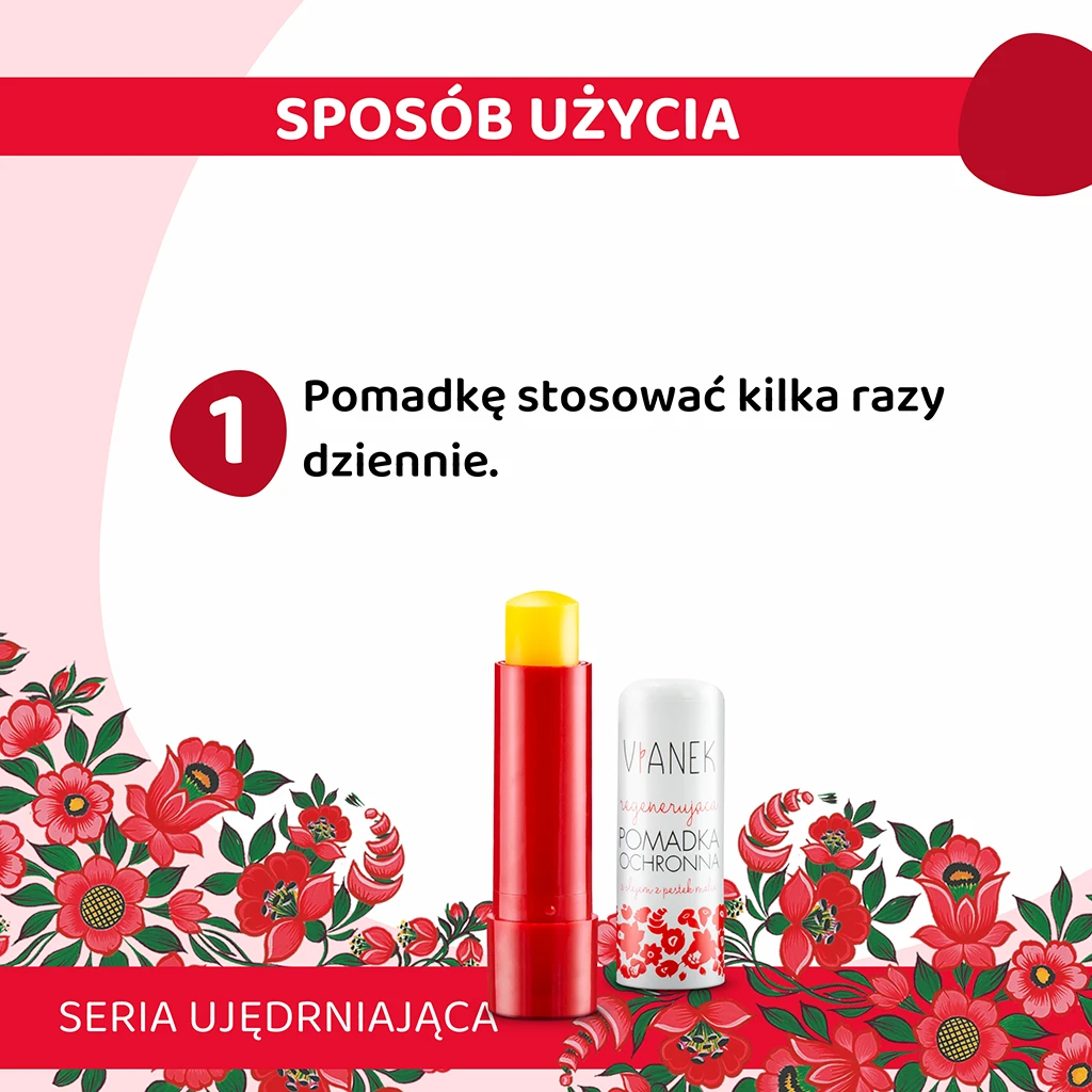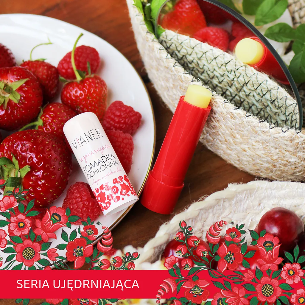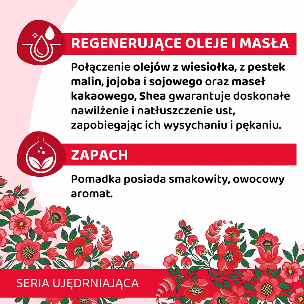Pomadka ochronna o właściwościach silnie regenerujących zawiera tłoczone na zimno oleje z wiesiołka, jojoba, malinowy i sojowy, a także masła kakaowe i shea. Systematyczne stosowanie zapobiega przesuszeniu i pękaniu delikatnego naskórka ust. Owocowy zapach i smak pomadki pozwala cieszyć się gładkimi ustami przez cały rok, niezależnie od warunków pogodowych.