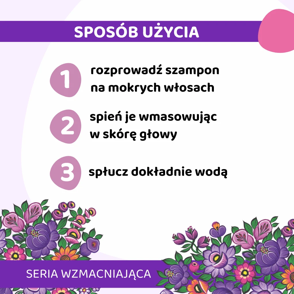 Rozprowadź szampon na mokrych włosach i spień wmasowując w skórę głowy. Dokładnie spłucz. W razie potrzeby można czynność powtórzyć.