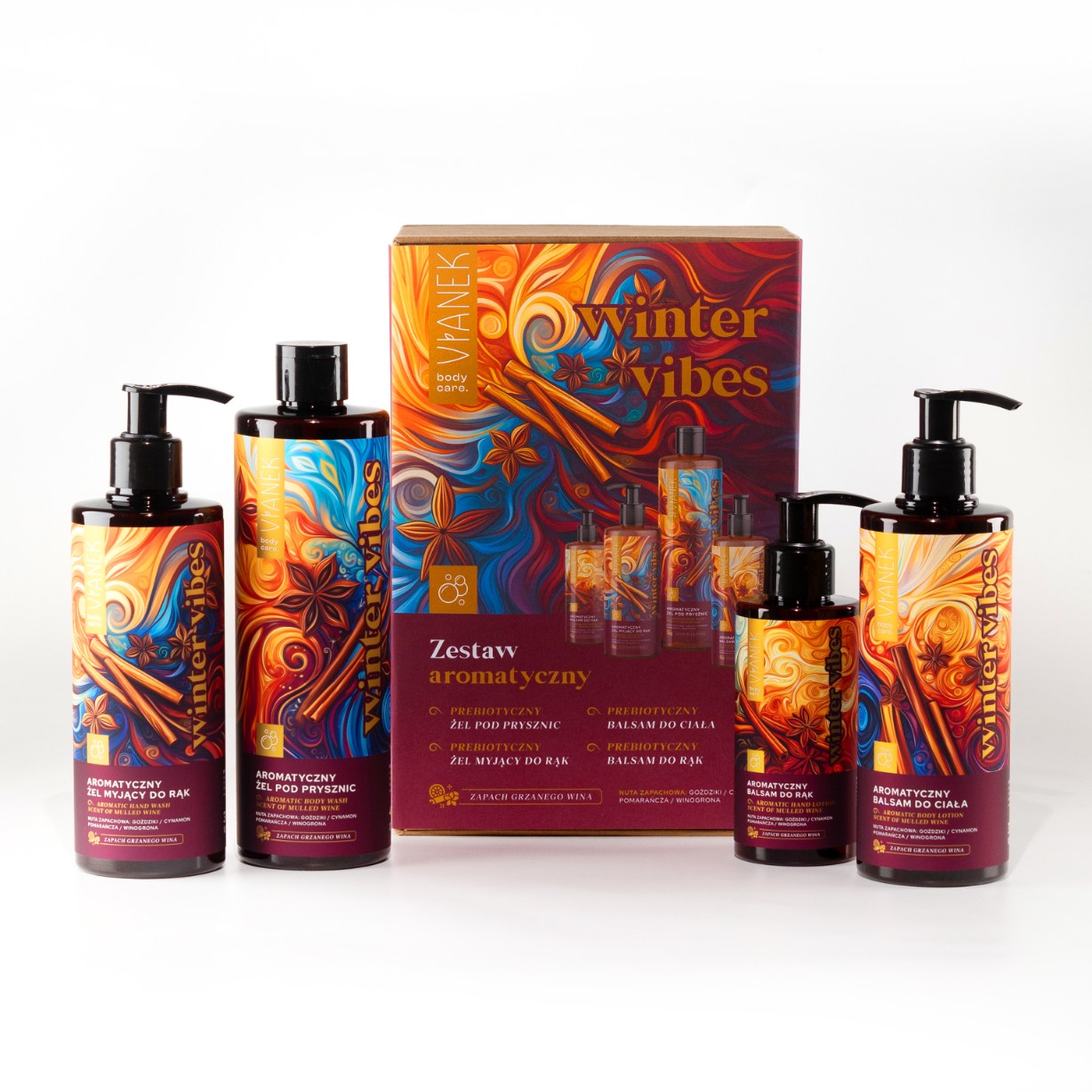 Odkryj magię zimowego relaksu z serią „Winter Vibes” – idealnym towarzyszem chłodnych wieczorów, który zamieni Twój dom w luksusowe SPA. Ta limitowana, zimowa kolekcja kosmetyków o zapachu grzanego wina wprowadzi Cię w przytulny nastrój, otulając aromatami goździków, cynamonu, soczystej pomarańczy, winogron, drzewa cedrowego i brązowego cukru.