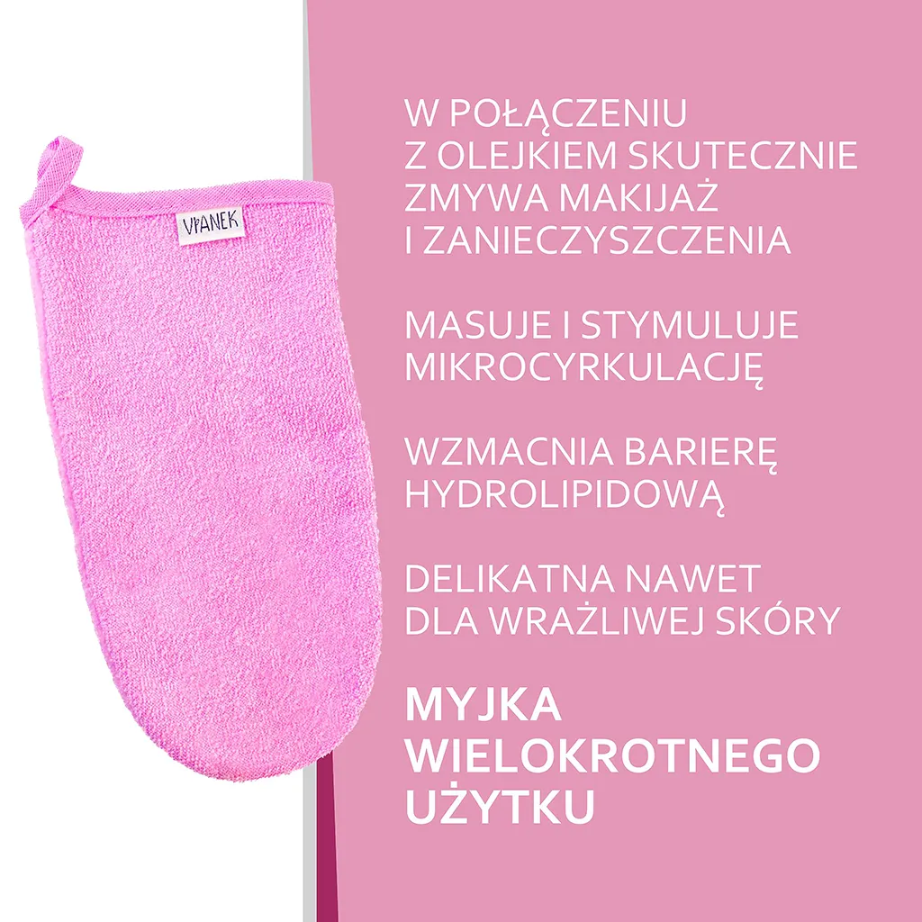 Niezwykle łatwa i wygodna w użyciu myjka pozwala na umiejętne oraz dokładne oczyszczenie twarzy. Dwustronna, z materiałem o wyraźnej fakturze, a także gładkiej, mięciutkiej powierzchni. W połączeniu z olejkiem tworzy idealny zestaw do zmywania makijażu. Dzięki swojej strukturze masuje twarz stymulując mikrocyrkulację oraz wzmacniając barierę hydrolipidową skóry. Wykonując delikatne, okrężne ruchy skutecznie pomaga usunąć zanieczyszczenia. Produkt przeznaczony jest dla wszystkich rodzajów cery, nawet dla najbardziej wrażliwej.