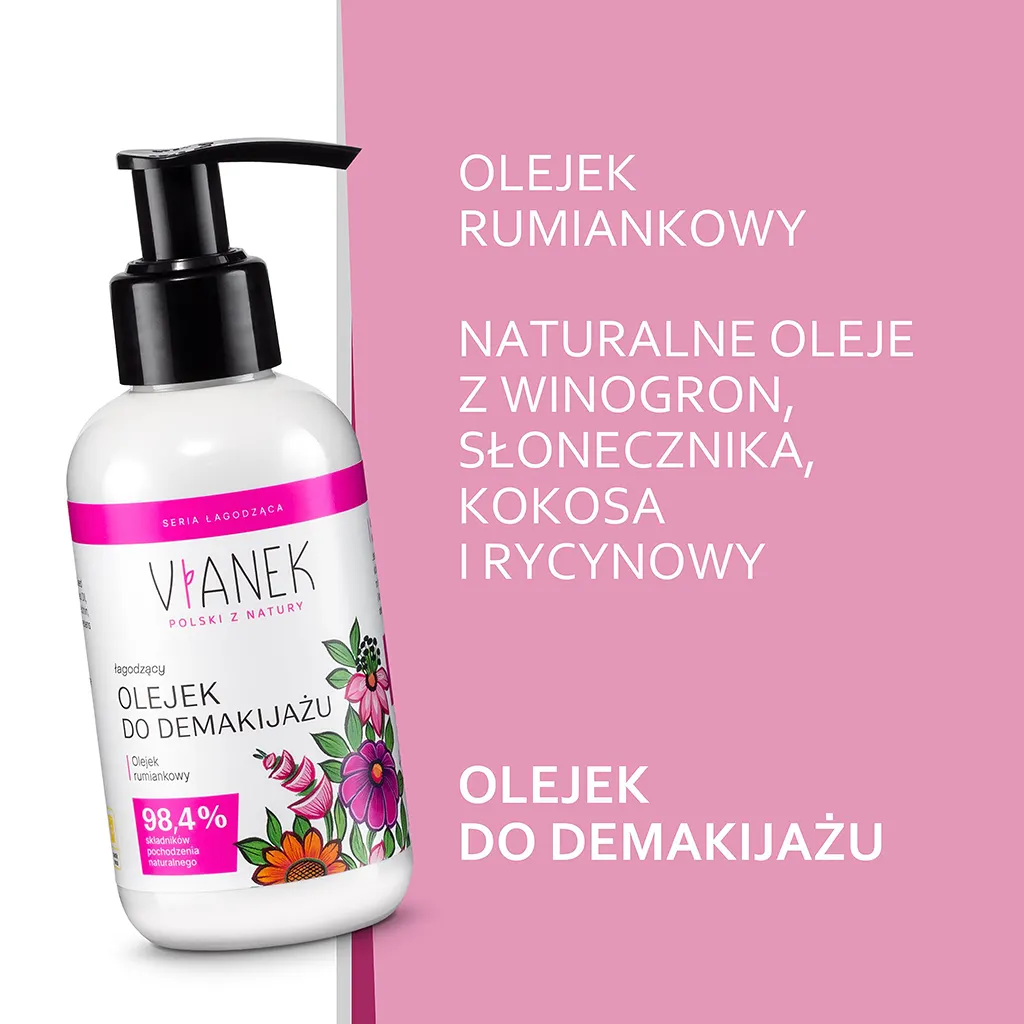 Wyjątkowy, niezwykle delikatny preparat do demakijażu oczu, twarzy i ust, którego bazę stanowią naturalne oleje roślinne, m.in. z pestek winogron, słonecznikowy i kokosowy oraz dogłębnie oczyszczający olej rycynowy. Olejek z rumianku lekarskiego to źródło związków o właściwościach przeciwalergicznych i silnie regenerujących, dzięki czemu olejek łagodzi także wszelkie podrażnienia i koi skórę m.in. w okolicach oczu i powiek. Po zastosowaniu pozostawia skórę oczyszczoną, nawilżoną i ukojoną.