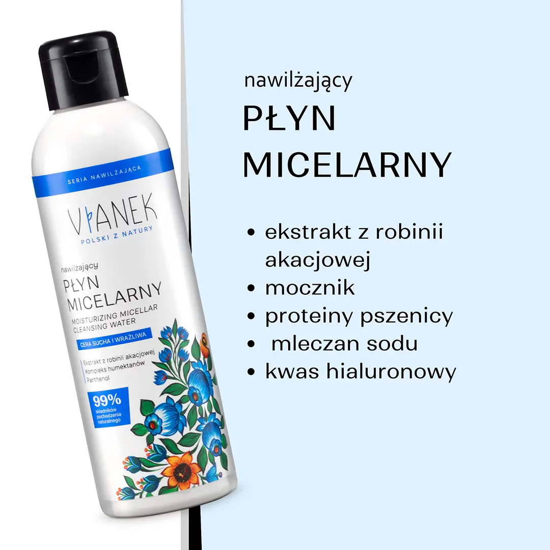 - VIANEK Nawilżający płyn micelarny – delikatnie, ale skutecznie usuwa makijaż i zanieczyszczenia, nie naruszając przy tym naturalnej bariery ochronnej skóry.